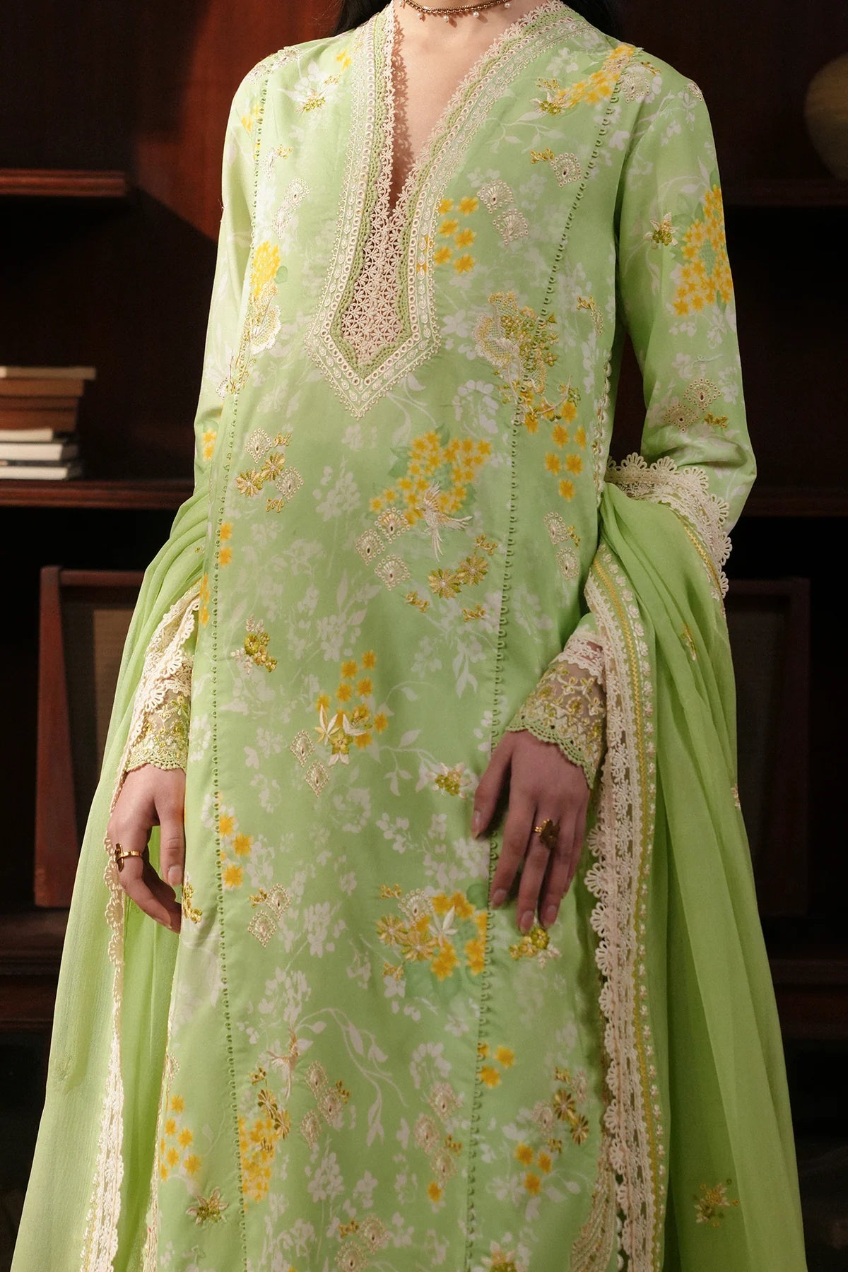 Organza Green Embroidered Front Border (3 Pcs), Sleeves Border (0.98 M), Front Chak Border (1.97 M), Front+Back Border (1.97 M), And Trouser Border (1.75 M) Add Delicate, Sheer Luxury And Refined Finishing With Fine Handcrafted Detailing.