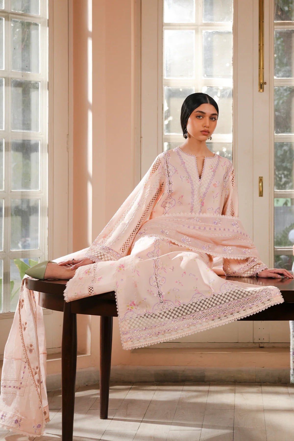 AFROZEH Florette'26 Mirel-FWU-0042-3PO Peach Brings Elegant, Sophisticated And Timeless Charm. The Printed Lawn Peach Digital Printed Embroidered Front Center Panel, Front Right Panel, Front Left Panel, Digital Printed Back, And Digital Printed Embroidered Sleeves Feature Beautiful Digital Print Combined With Exquisite Embroidery On Premium Lawn That Gives A Soft, Breathable, And High-End Appearance.