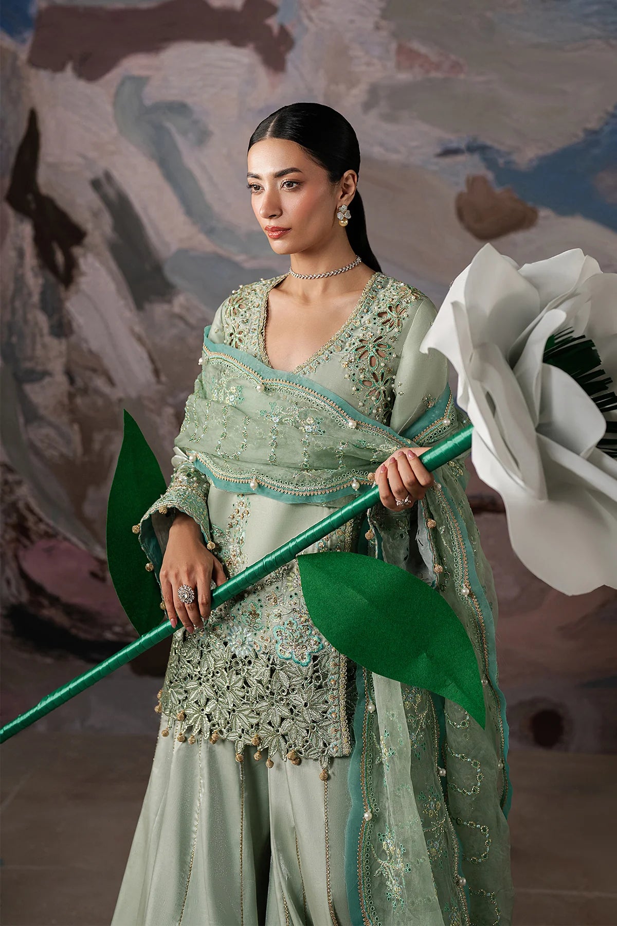 Shine in mint serenity with AYZEL GLOWEN-04 — a hand-embellished mint green gleam silk front, embroidered organza dupatta, and dyed trouser. Perfect for mehndi, day weddings, and fresh elegance.