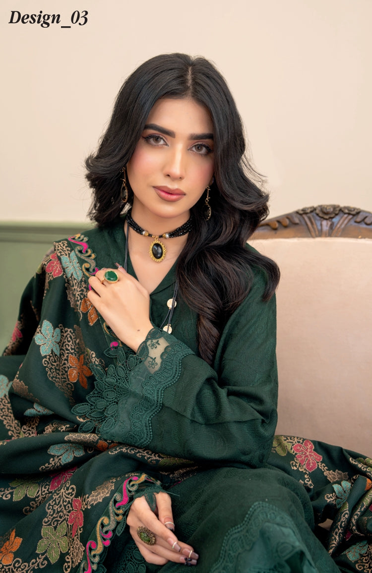 Weave your story in elegance with RIAZ ARTS Dastan Design-03 — a luxurious self jacquard zari peach shirt, zari peach trouser, and fancy jacquard kani wool shawl. Perfect for winter festivals, weddings, and timeless grace.