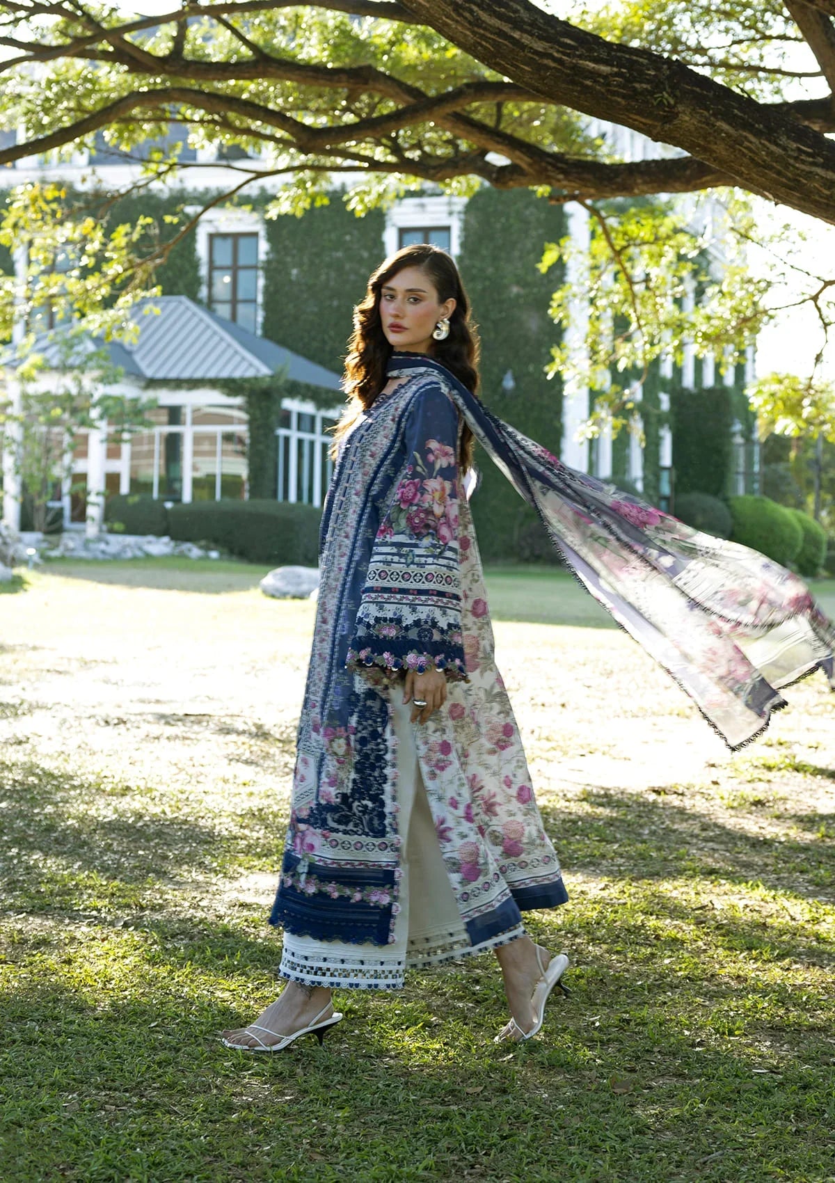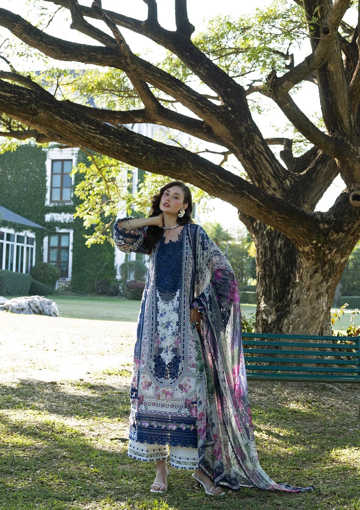 CLASSIC & CHARMING ELEGANCE IN ELAF PREMIUM SIGNATURE ESA-2A VERONICA — DIGITAL PRINTED EMBROIDERED LAWN SHIRT WITH INTRICATE ORGANZA MOTIFS AND BORDERS, DIGITAL PRINTED CHIFFON DUPATTA, AND SOLID DYED CAMBRIC TROUSER. PERFECT FOR EID, SUMMER CELEBRATIONS, AND CHARMING LUXURY.