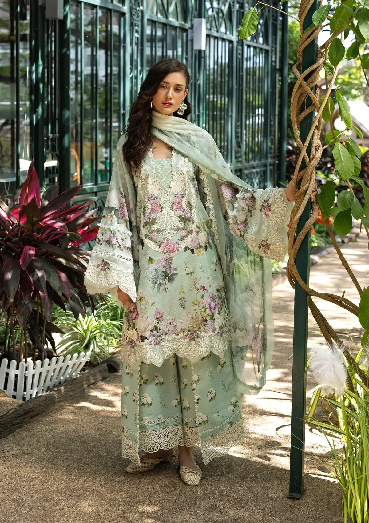 FRESH MINT MEADOW ELEGANCE IN ELAF PREMIUM SIGNATURE ESA-4B MINT MEADOW — DIGITAL PRINTED EMBROIDERED LAWN SHIRT WITH INTRICATE ORGANZA MOTIFS AND BORDERS, DIGITAL PRINTED CHIFFON DUPATTA, AND SOLID DYED CAMBRIC TROUSER. PERFECT FOR EID, SUMMER FESTIVALS, AND REFRESHING LUXURY.