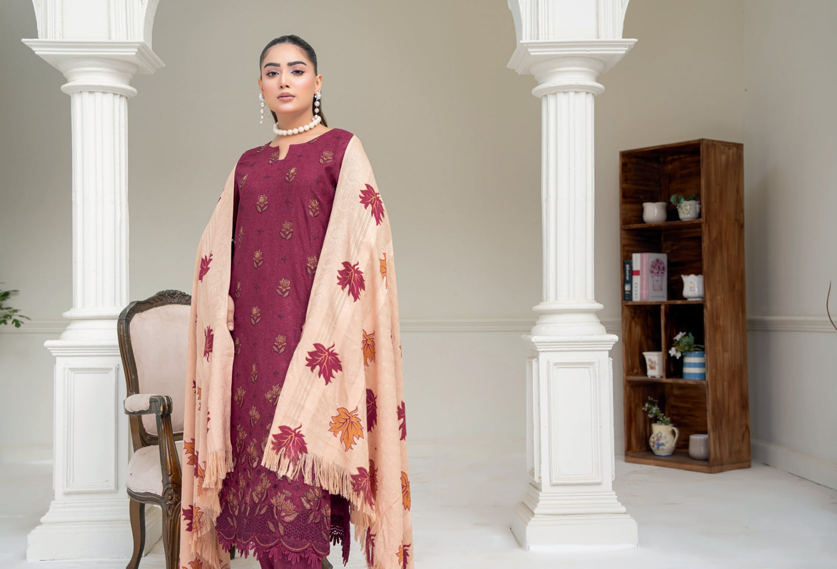 Sing your elegance in RIAZ ARTS Ghazal Design-02 — a zari marina jacquard embroidered shirt, zari jacquard print vinyl wool shawl, and plain zari marina trouser. Perfect for winter evenings, poetry, and timeless grace.