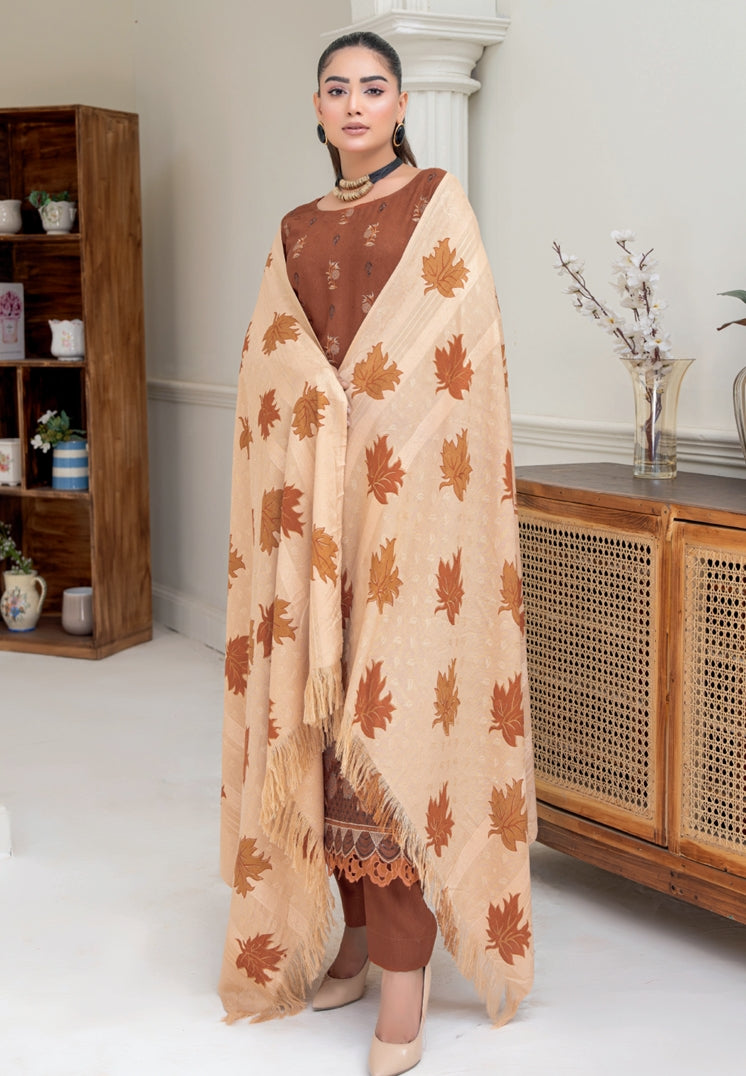 Sing your elegance in RIAZ ARTS Ghazal Design-04 — a zari marina jacquard embroidered shirt, zari jacquard print vinyl wool shawl, and plain zari marina trouser. Perfect for winter evenings, poetry, and timeless grace.