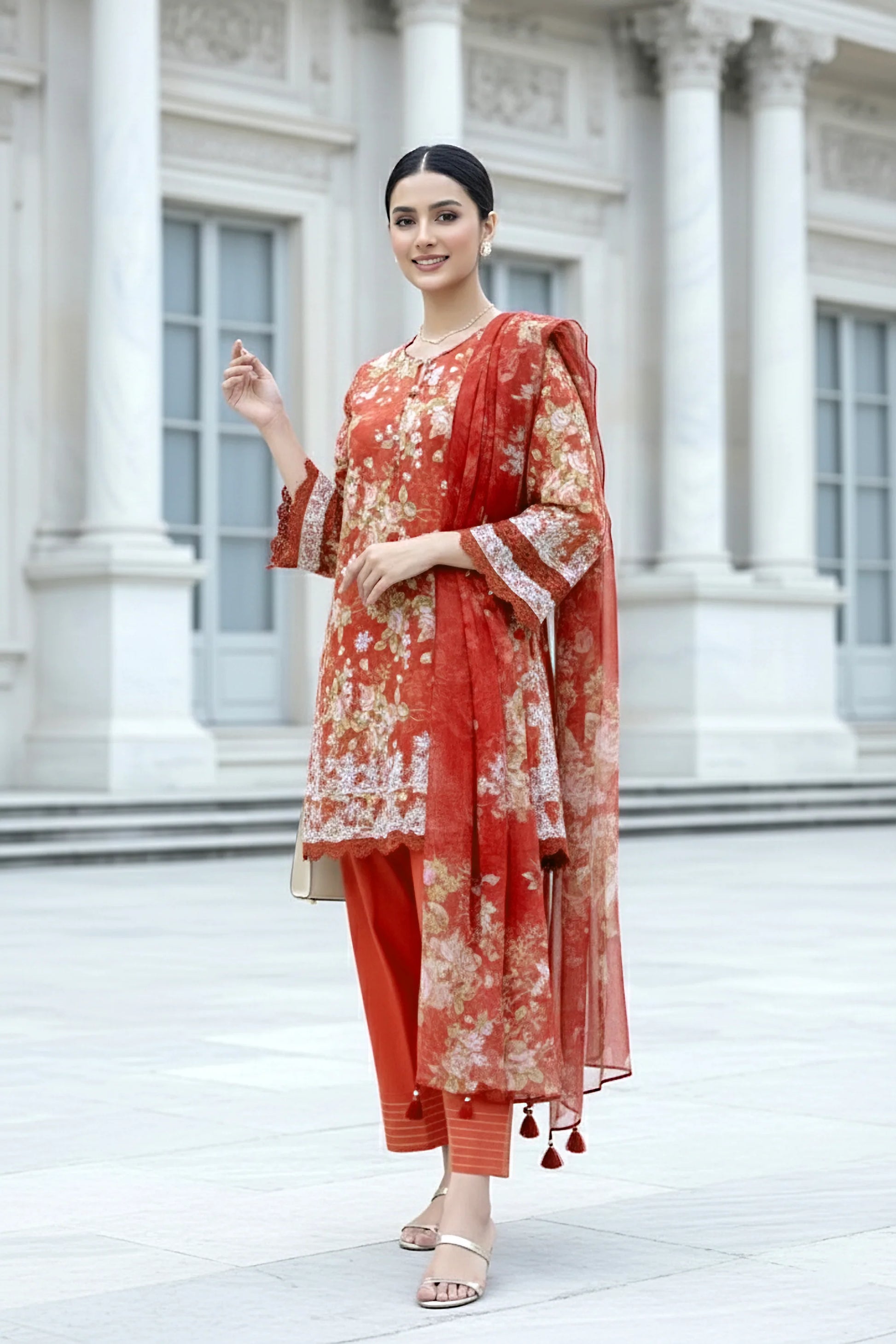 Vibrant orange energy in LAKHANY Komal Lawn LG-RL-0365 — printed embroidered lawn front & sleeves, printed lawn back, printed chiffon dupatta, embroidered border, and dyed lawn trouser. Perfect for cheerful summer days, Eid, and lively elegance.