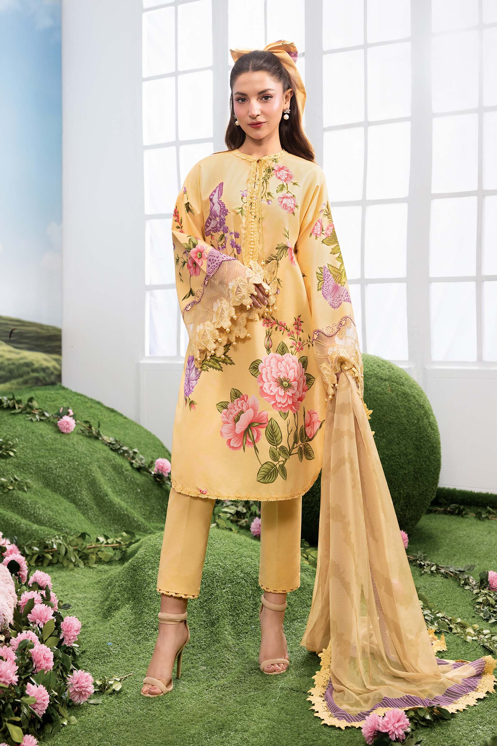 Printed Lawn In M.Basic By MARIA.B. Dreamscape MB-CUSV14-04B — Printed Lawn Shirt With Embroidered Patti, Printed Chiffon Dupatta, And Dyed Cambric Trouser In Beautiful Pale Yellow. Perfect For Eid, Summer, Casual Festive, And Graceful Elegant Look.