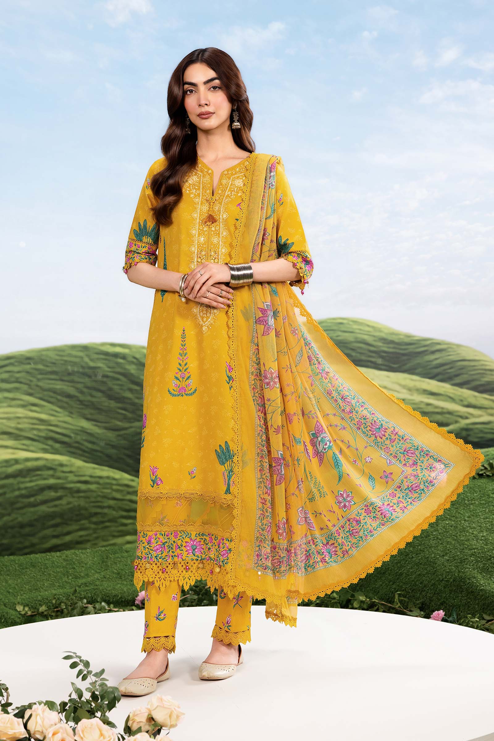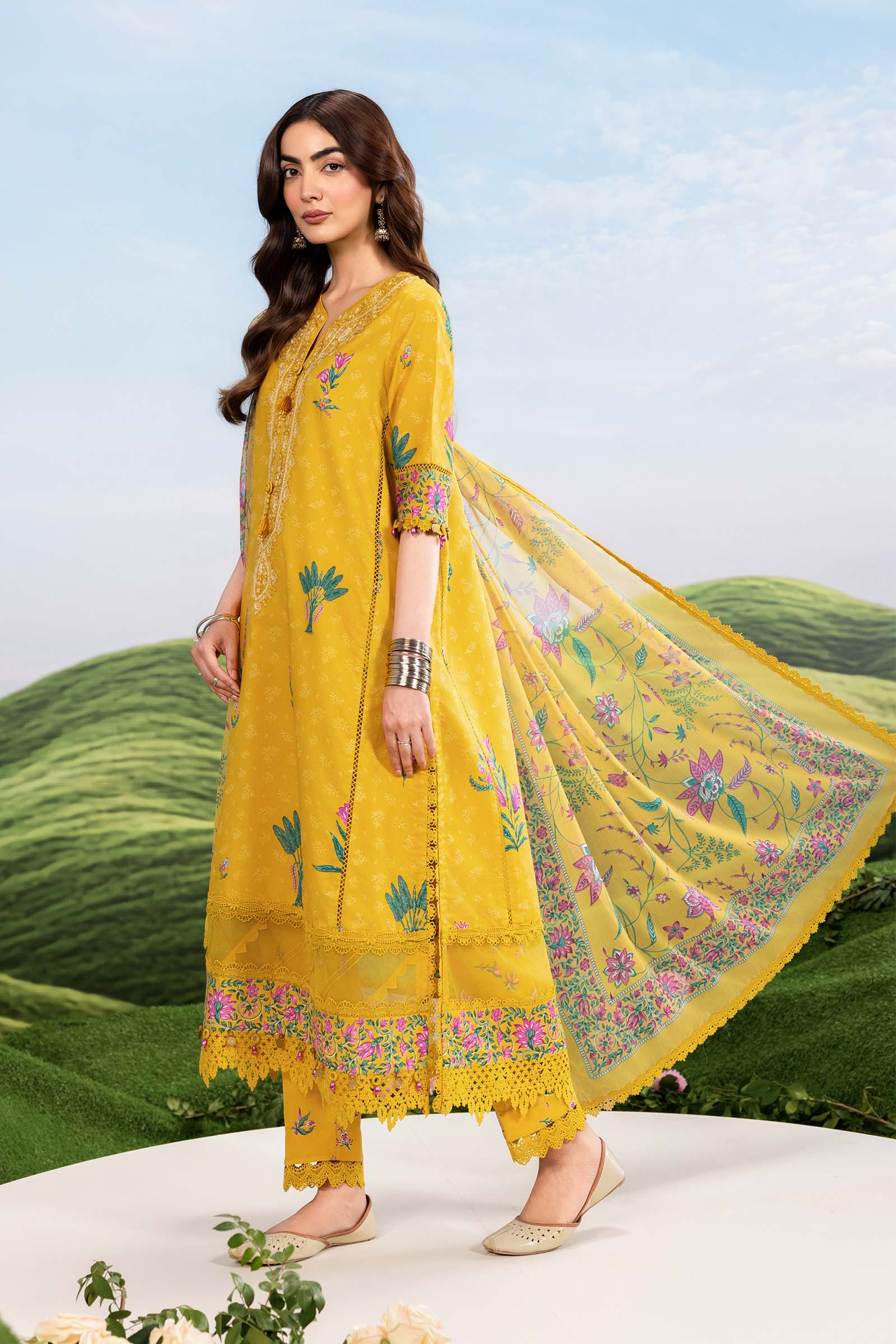 Printed Lawn In M.Basic By MARIA.B. Dreamscape MB-CUSV14-03A — Printed Lawn Shirt With Embroidered Neck Patch, Printed Chiffon Dupatta, And Printed Cambric Trouser In Beautiful Mustard. Perfect For Eid, Summer, Casual Festive, And Graceful Elegant Look.