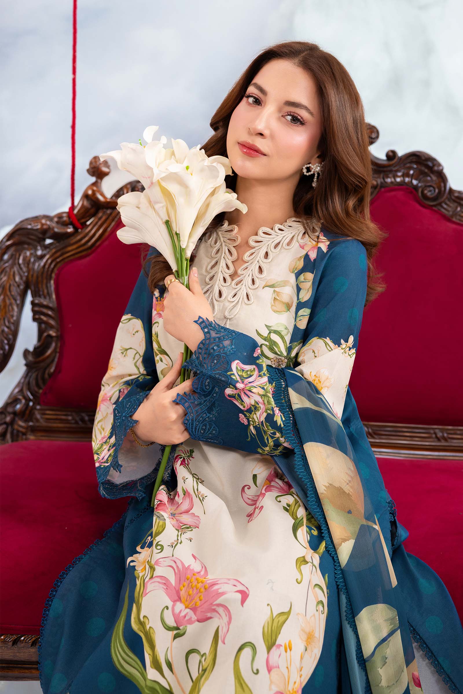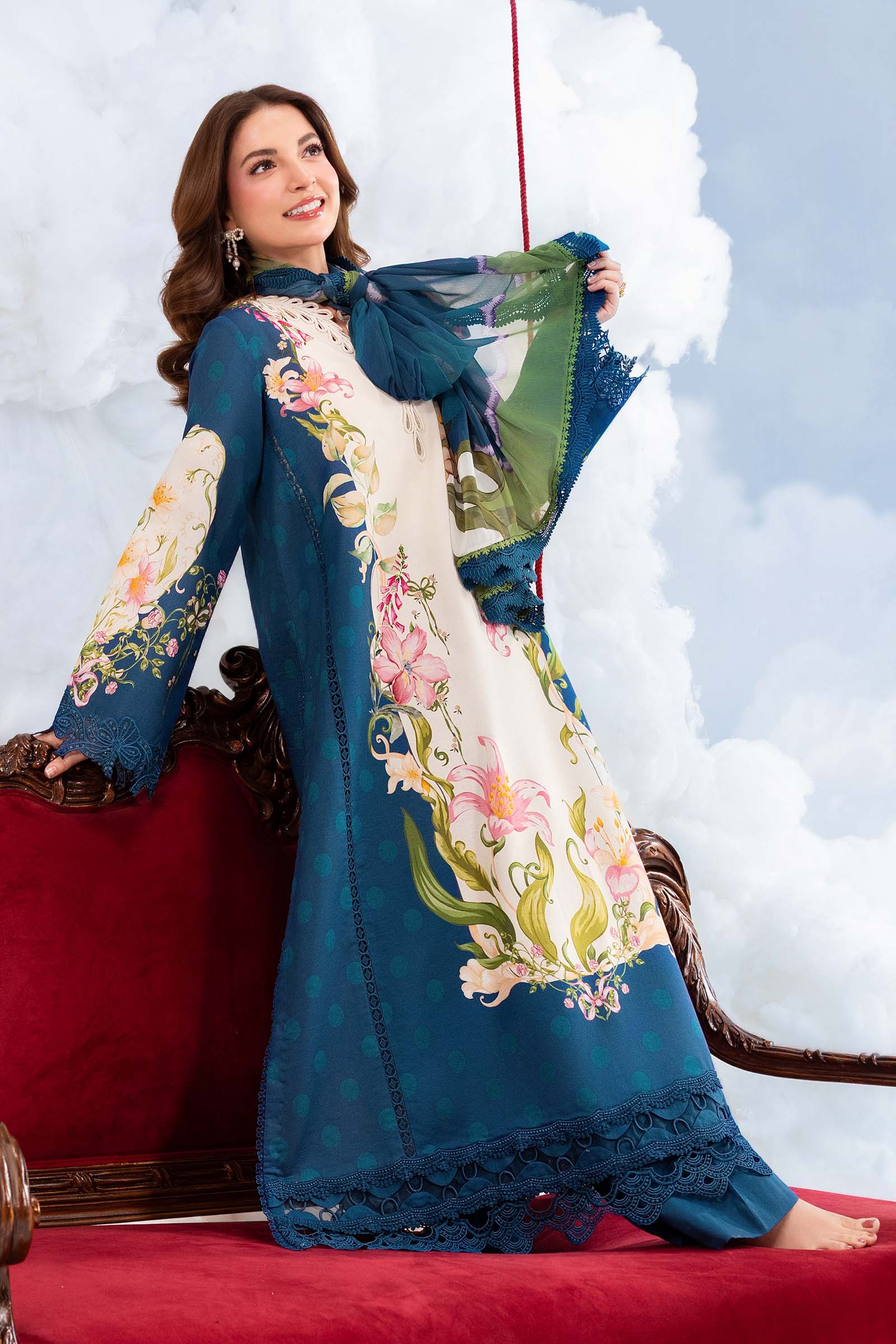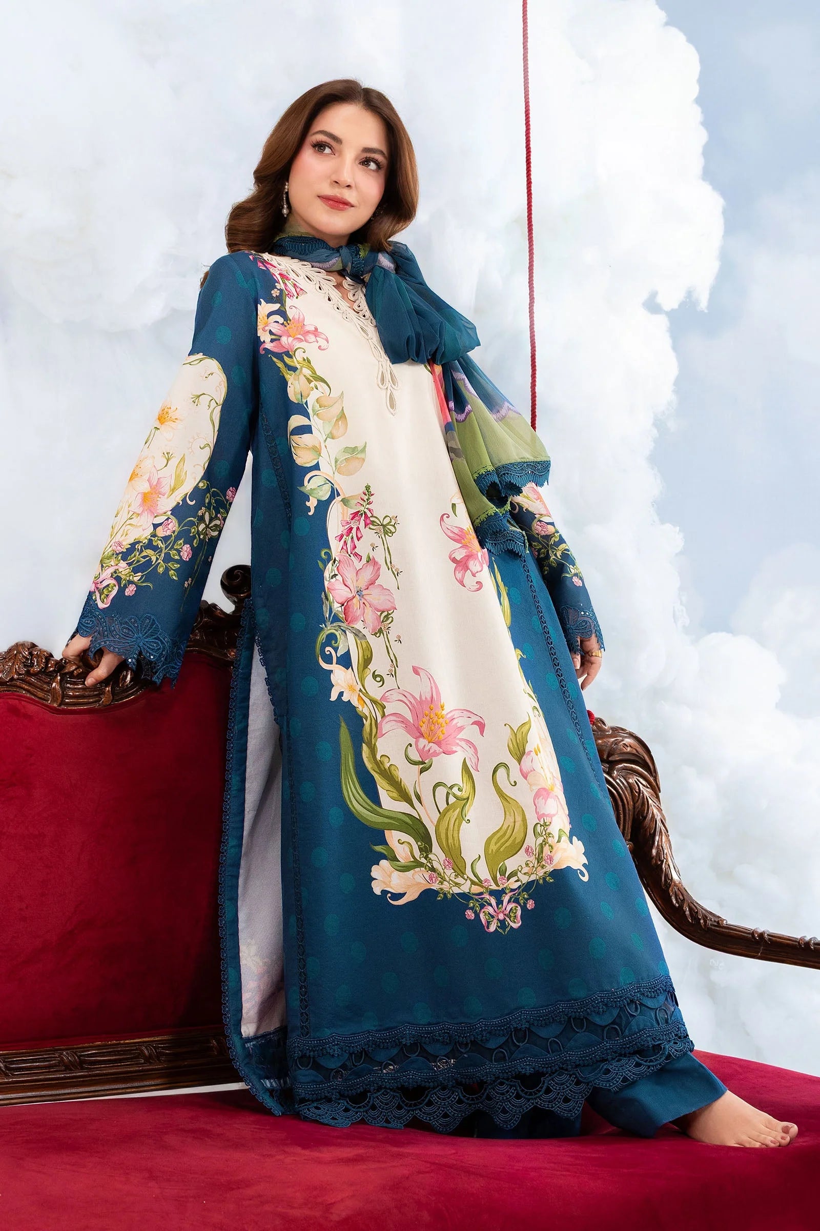 M.Basic By MARIA.B. Dreamscape MB-CUSV14-05B Brings Fresh, Elegant And Timeless Charm. The Printed Lawn Shirt Features Beautiful Print On Premium Lawn With Delicate Embroidered Patti That Gives A Soft, Breathable, Vibrant, And High-End Appearance In A Stunning Navy Blue Hue.