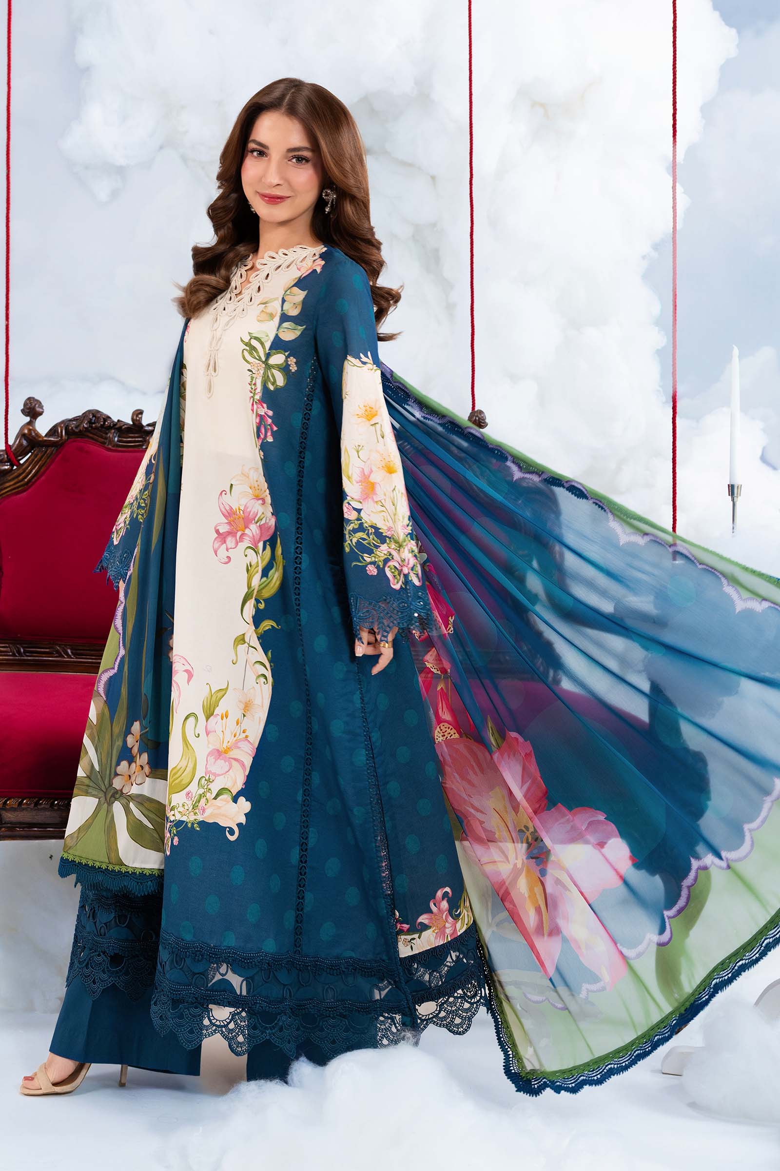 Printed Lawn In M.Basic By MARIA.B. Dreamscape MB-CUSV14-05B — Printed Lawn Shirt With Embroidered Patti, Printed Chiffon Dupatta, And Dyed Cambric Trouser In Beautiful Navy Blue. Perfect For Eid, Summer, Casual Festive, And Graceful Elegant Look.