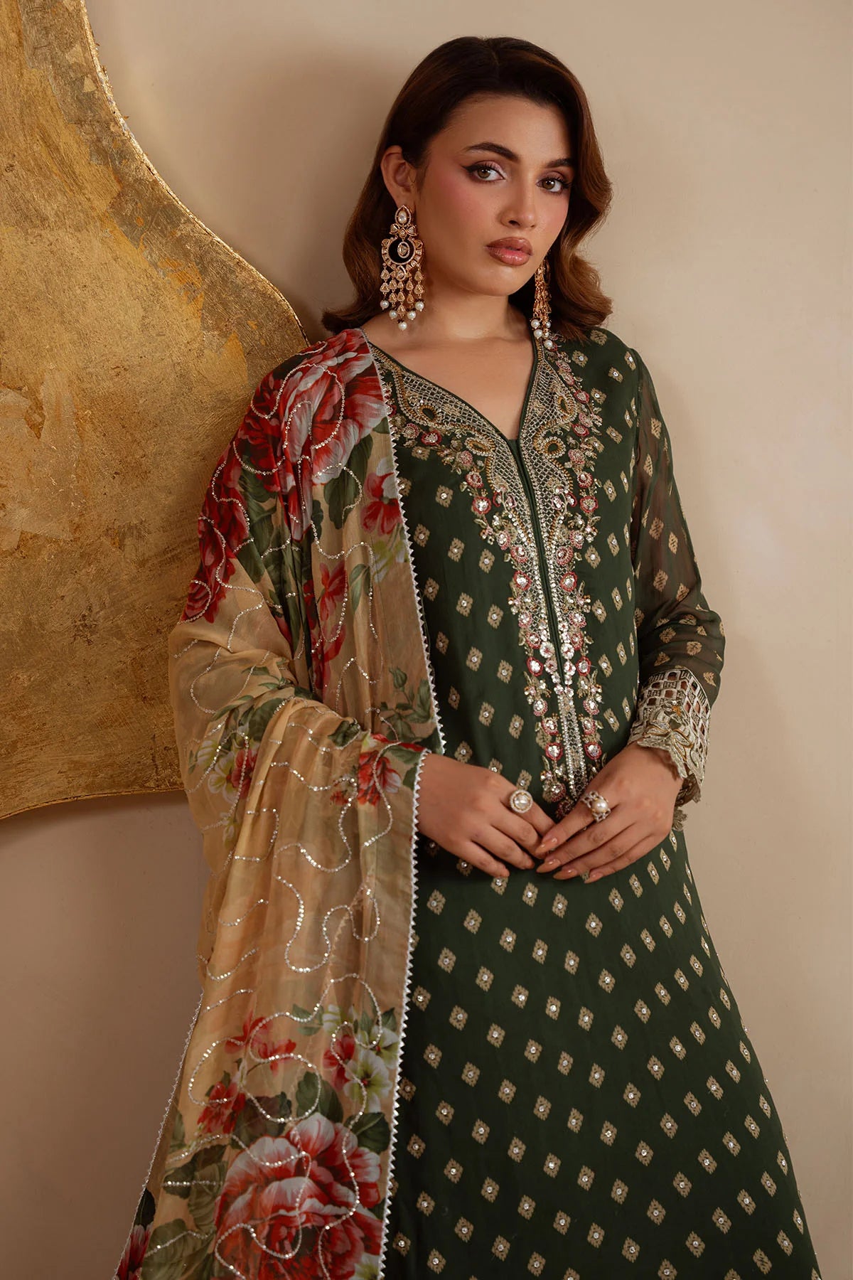 Embroidered organza sleeve border, front & back daman patch, front & back border add regal detail, while embroidered and printed chiffon dupatta with embroidered organza pallu border drapes like a royal veil.