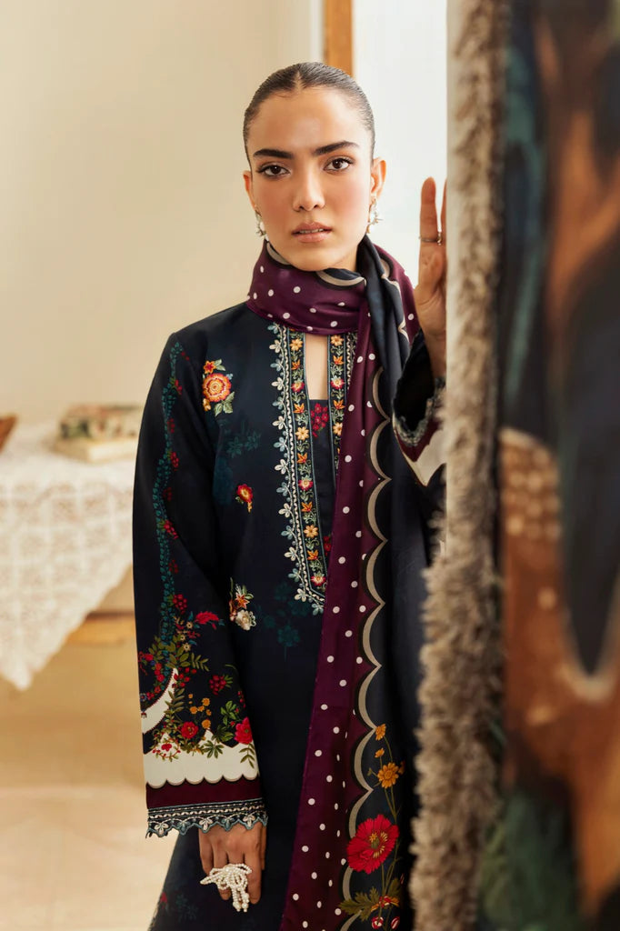A stunning 3-piece unstitched embroidered and printed marina suit that perfectly balances sophistication and comfort. Featuring an embroidered & printed marina front, digitally printed sleeves and back, an embroidered shawl, and dyed marina trouser — this design is a winter wardrobe essential for those who appreciate timeless elegance.