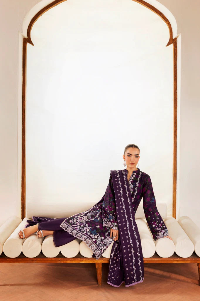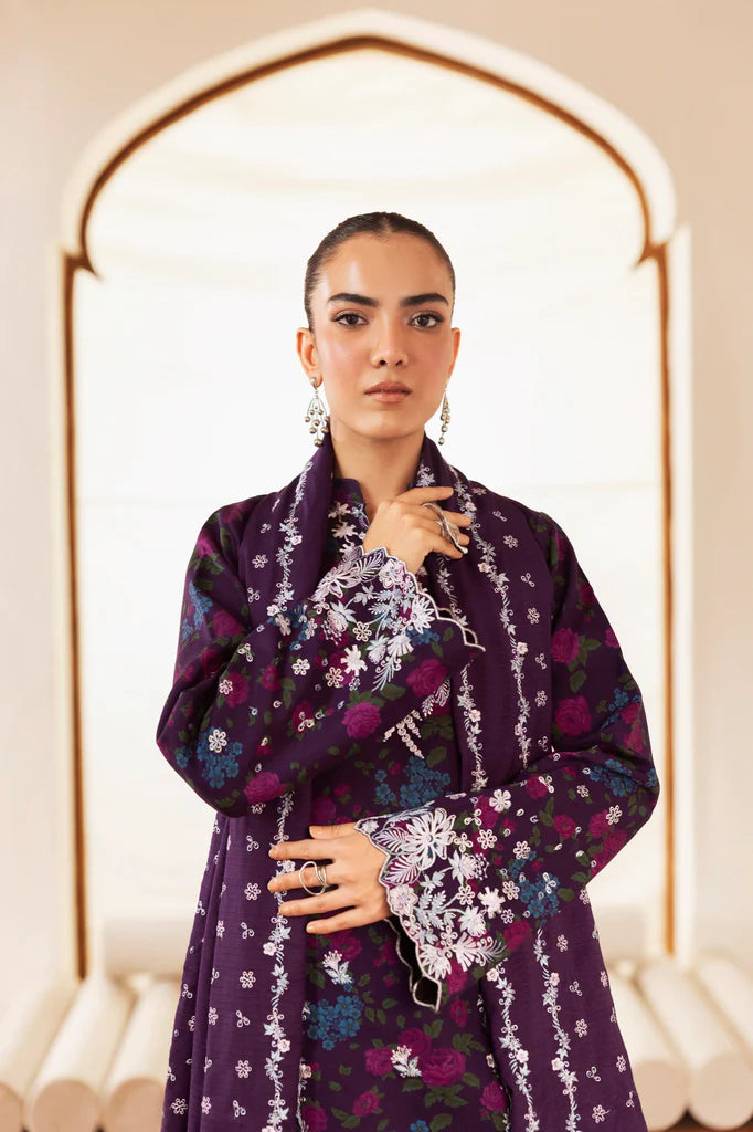 A stunning 3-piece unstitched embroidered and printed marina suit featuring a beautifully embroidered & printed marina front and sleeves, a digital printed marina back, an intricately embroidered lace for the hem, a dyed marina trouser, and an elegant embroidered shawl. Perfect for timeless sophistication and cozy winter charm.