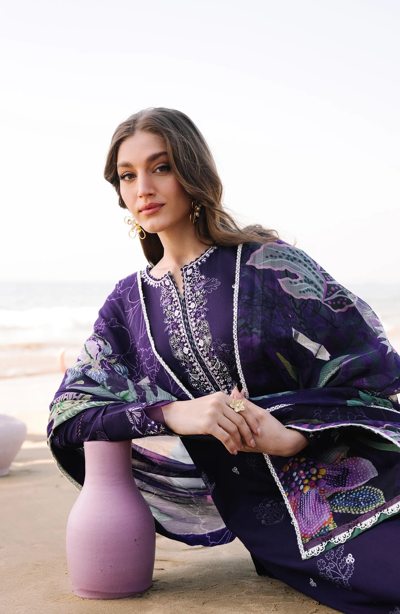Elegant Paste Printed & Embroidered Lawn In SERAN Afsanah Elin D-08 — Paste Printed & Embroidered Lawn Shirt With Front, Back, Sleeves, Embroidered Organza Neckline, Embroidered Organza Sleeves & Front Hem Border, Printed Crinkle Chiffon Dupatta, And Dyed Cotton Trouser. Perfect For Summer, Eid, Festive Occasions, And Graceful Elegant Look.