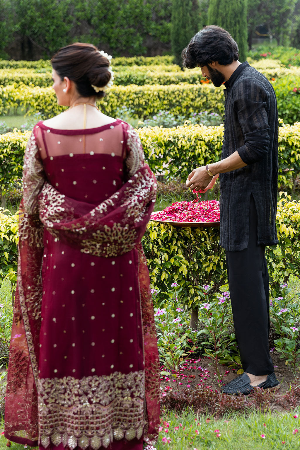 Exuding timeless elegance, this deep maroon ensemble is a true heirloom piece crafted to perfection. The long front-open gown features exquisite embroidery with shimmering sequins, and Resham threadwork, forming intricate floral and geometric patterns. The richly detailed design flows seamlessly into a regal silhouette, perfectly paired with wide-leg trousers for a modern yet traditional charm. A delicately adorned dupatta with heavy borders and scattered motifs completes this masterpiece, adding layers of sophistication. Perfect for brides and wedding.