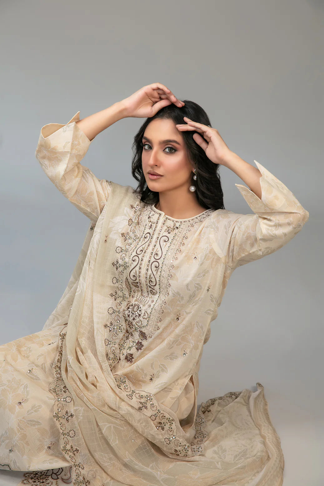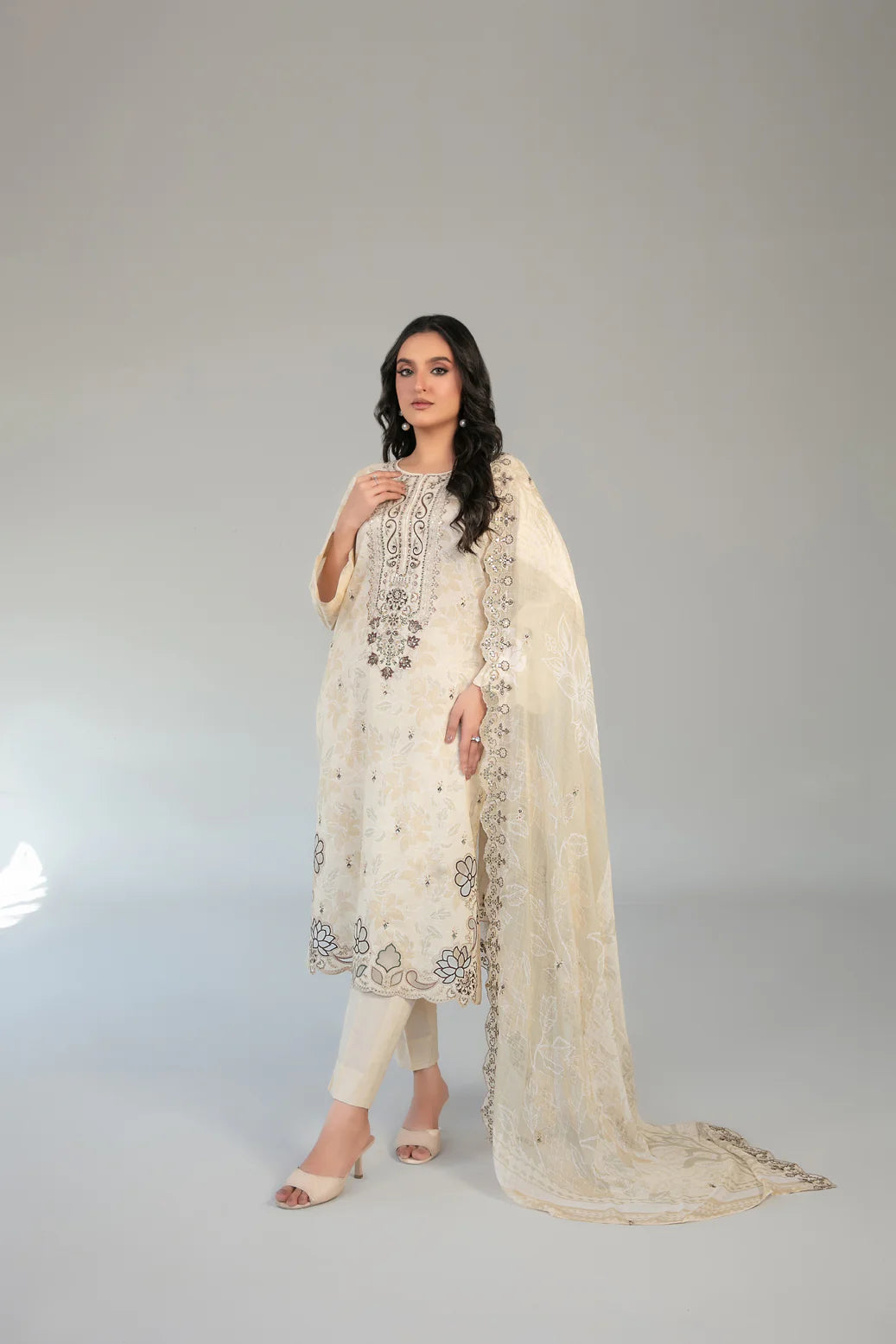 ✔️ Dupatta: Cutwork Embroidered Digital Printed Chiffon – Lightweight, Flowy