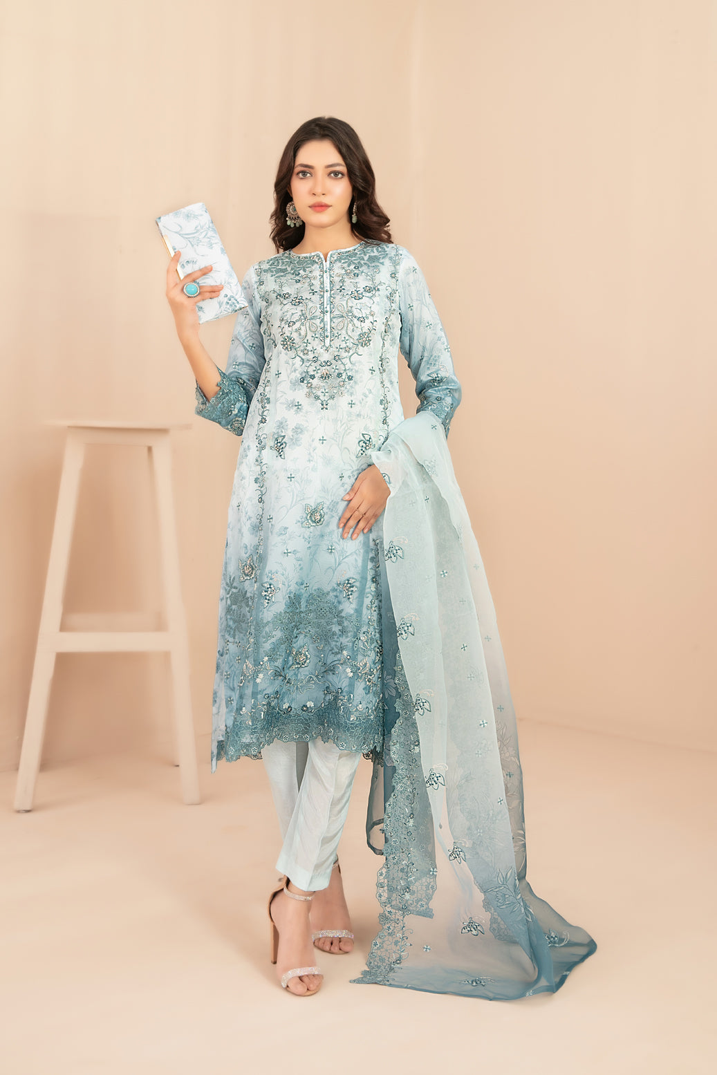 Exclusive fancy embroidered organza dupatta flows like poetry, paired with unstitched plain staple shalwar fabric for perfect fit.