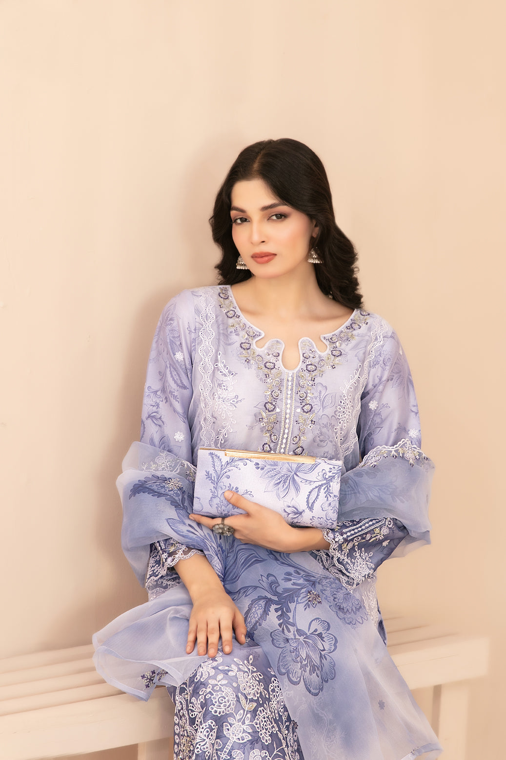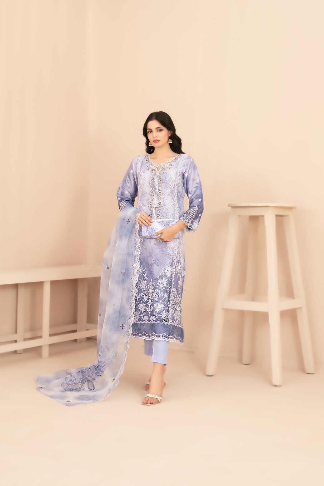 Exclusive fancy embroidered organza dupatta flows like poetry, paired with unstitched plain staple shalwar fabric for perfect fit.
