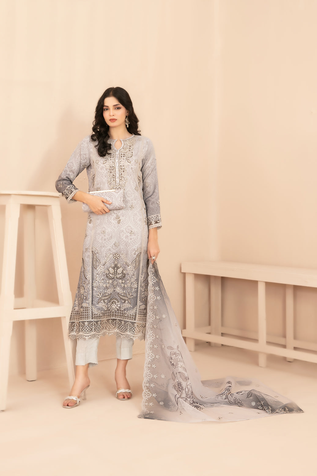 Exclusive fancy embroidered organza dupatta flows like poetry, paired with unstitched plain staple shalwar fabric for perfect fit.