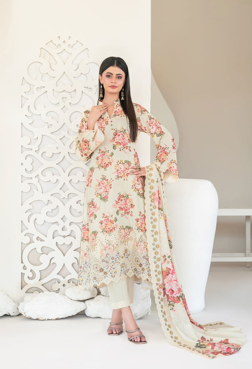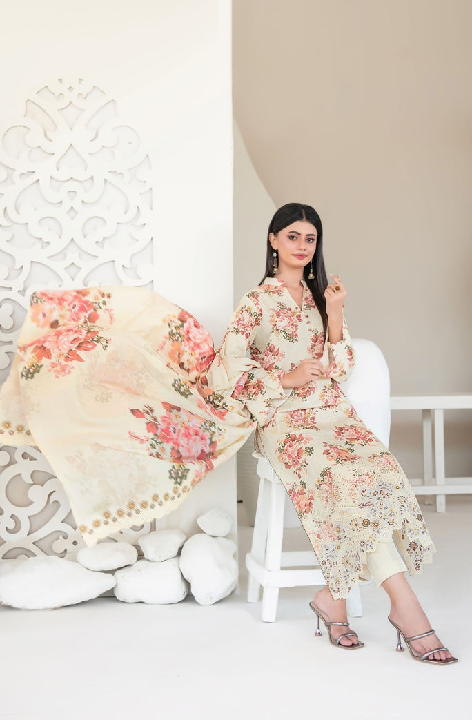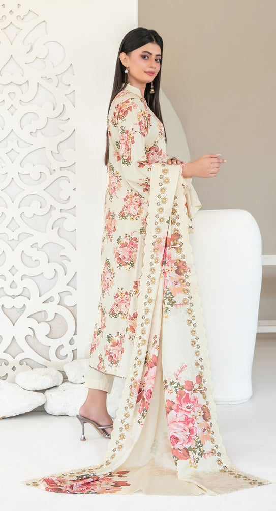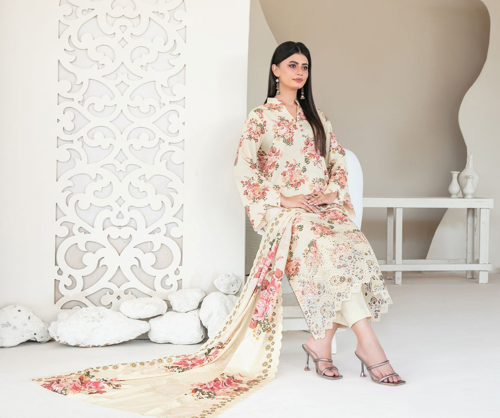 Un-stitched embroidered digital printed staple shirt designs bloom with delicate artistry, paired with embroidered digital printed staple shawl dupatta that drapes like a joyful veil.