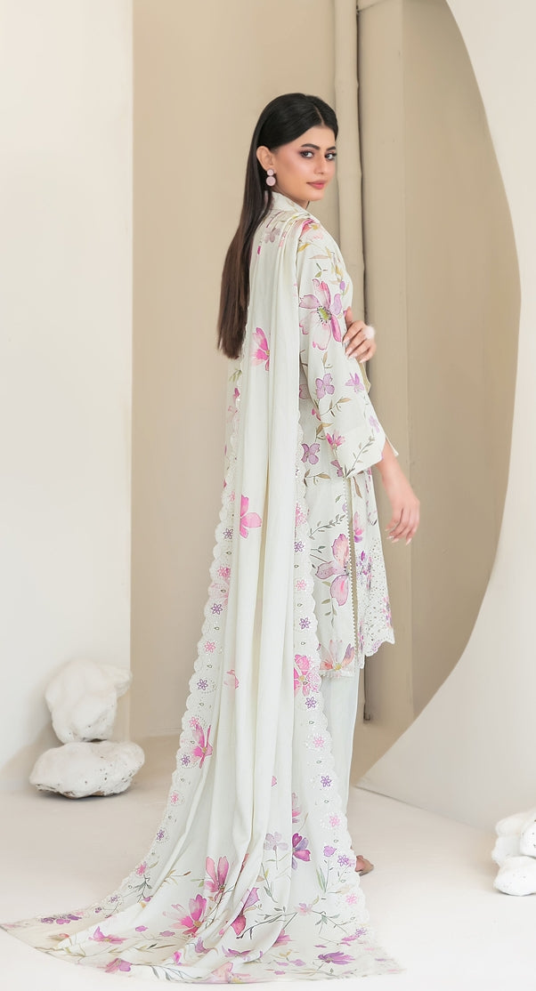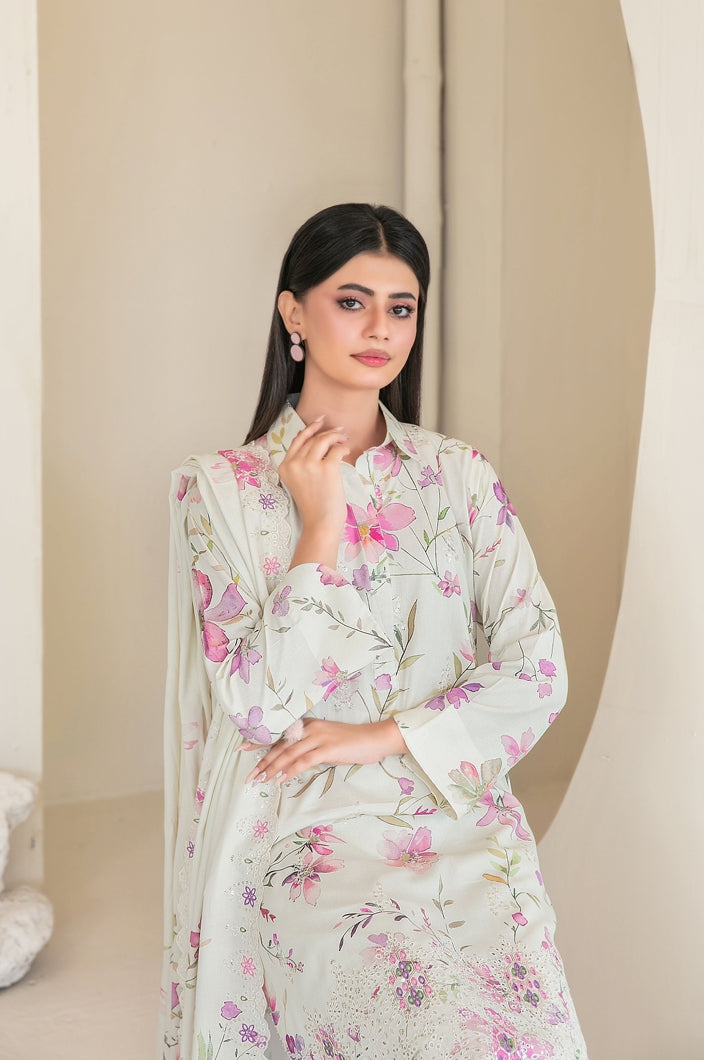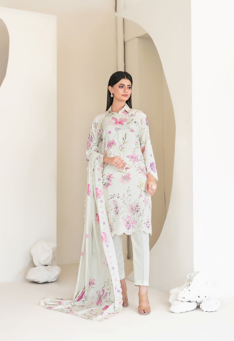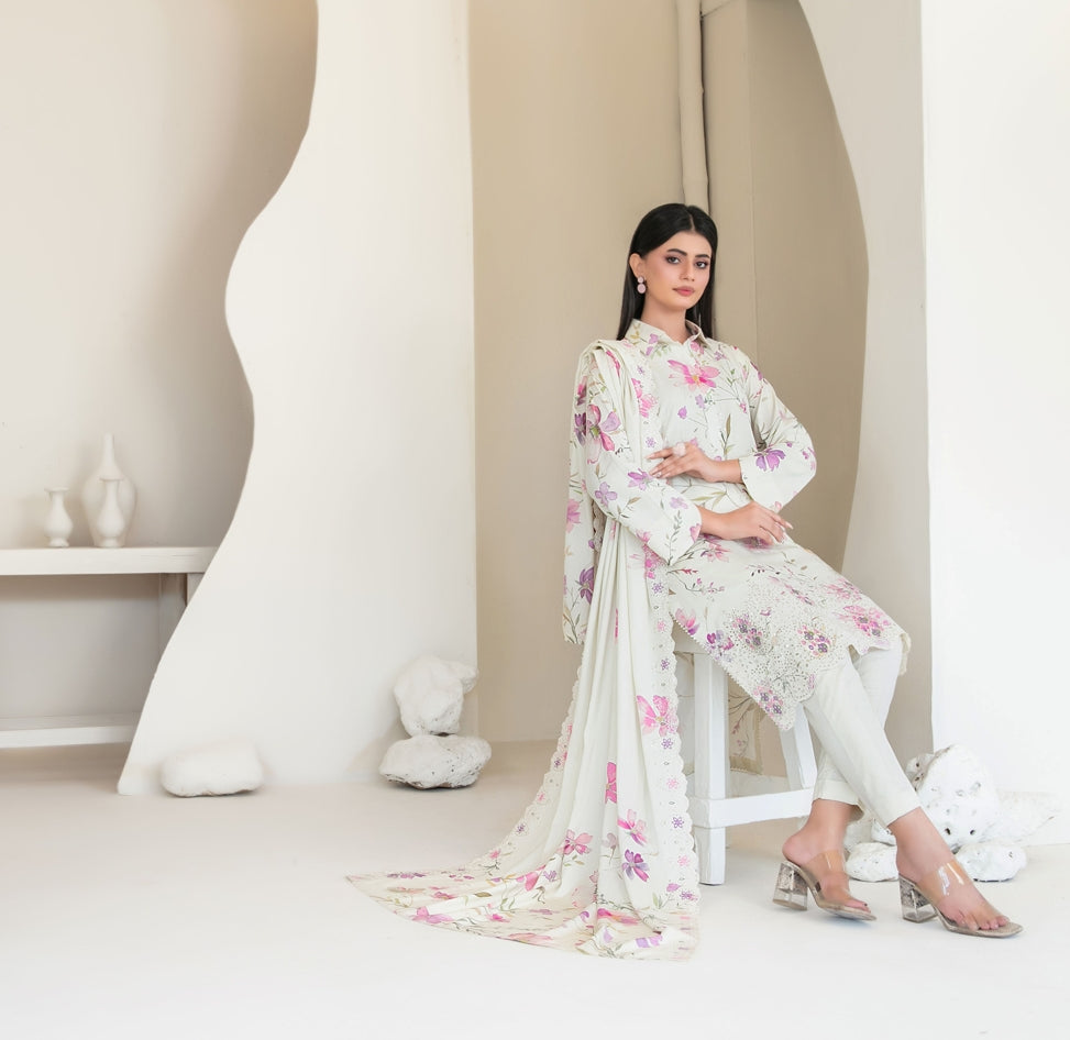 Un-stitched embroidered digital printed staple shirt designs bloom with delicate artistry, paired with embroidered digital printed staple shawl dupatta that drapes like a joyful veil.