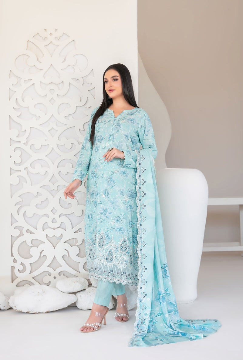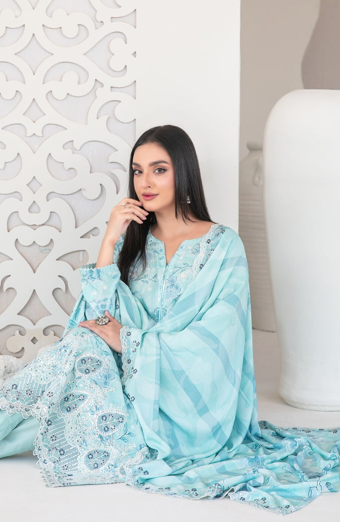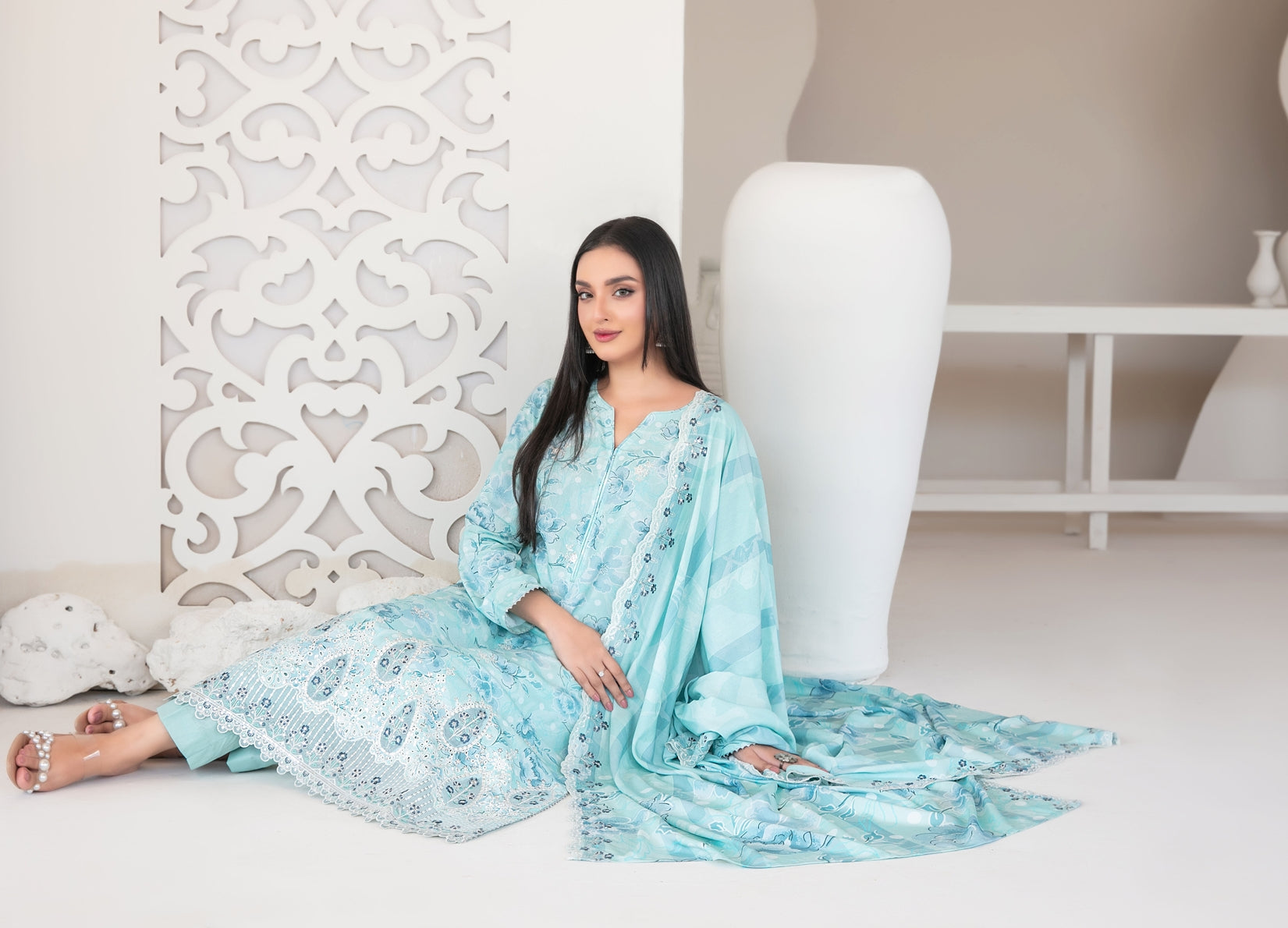Un-stitched embroidered digital printed staple shirt designs bloom with delicate artistry, paired with embroidered digital printed staple shawl dupatta that drapes like a joyful veil.