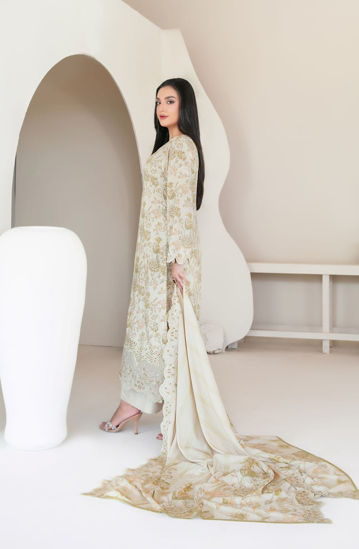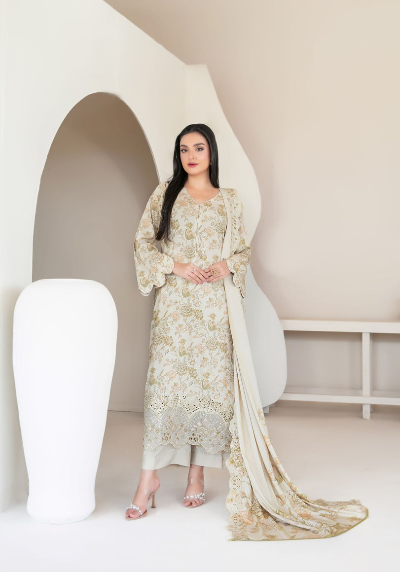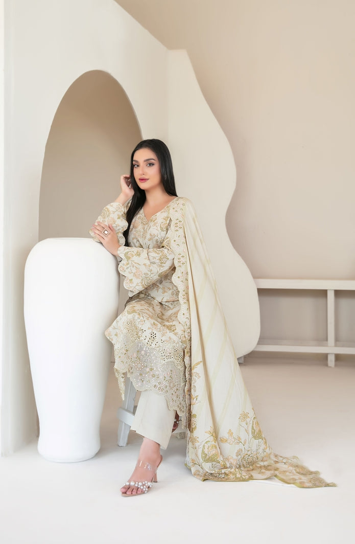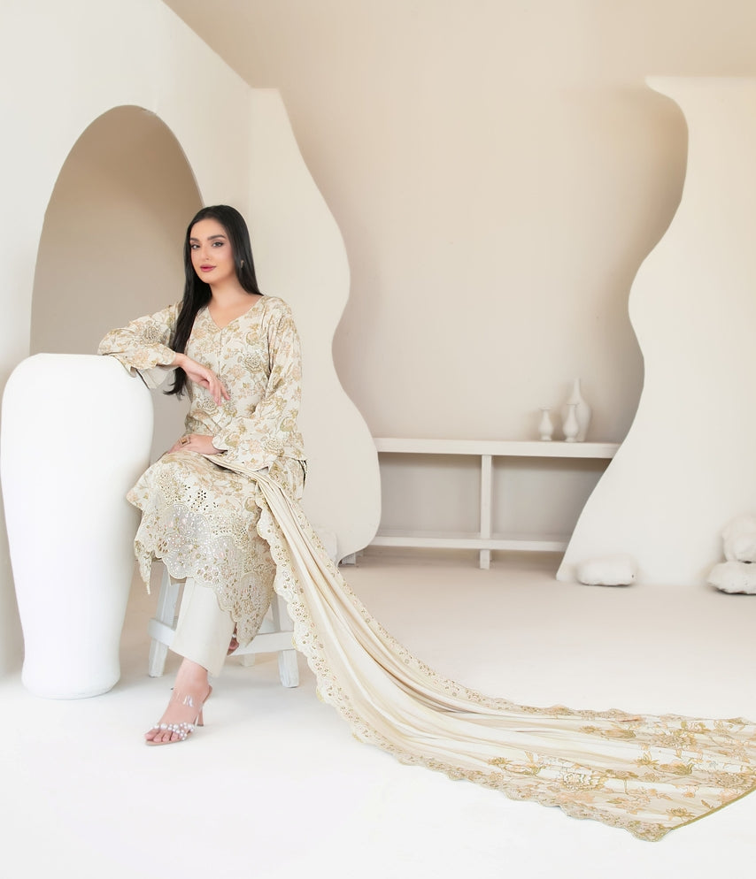 Un-stitched embroidered digital printed staple shirt designs bloom with delicate artistry, paired with embroidered digital printed staple shawl dupatta that drapes like a joyful veil.