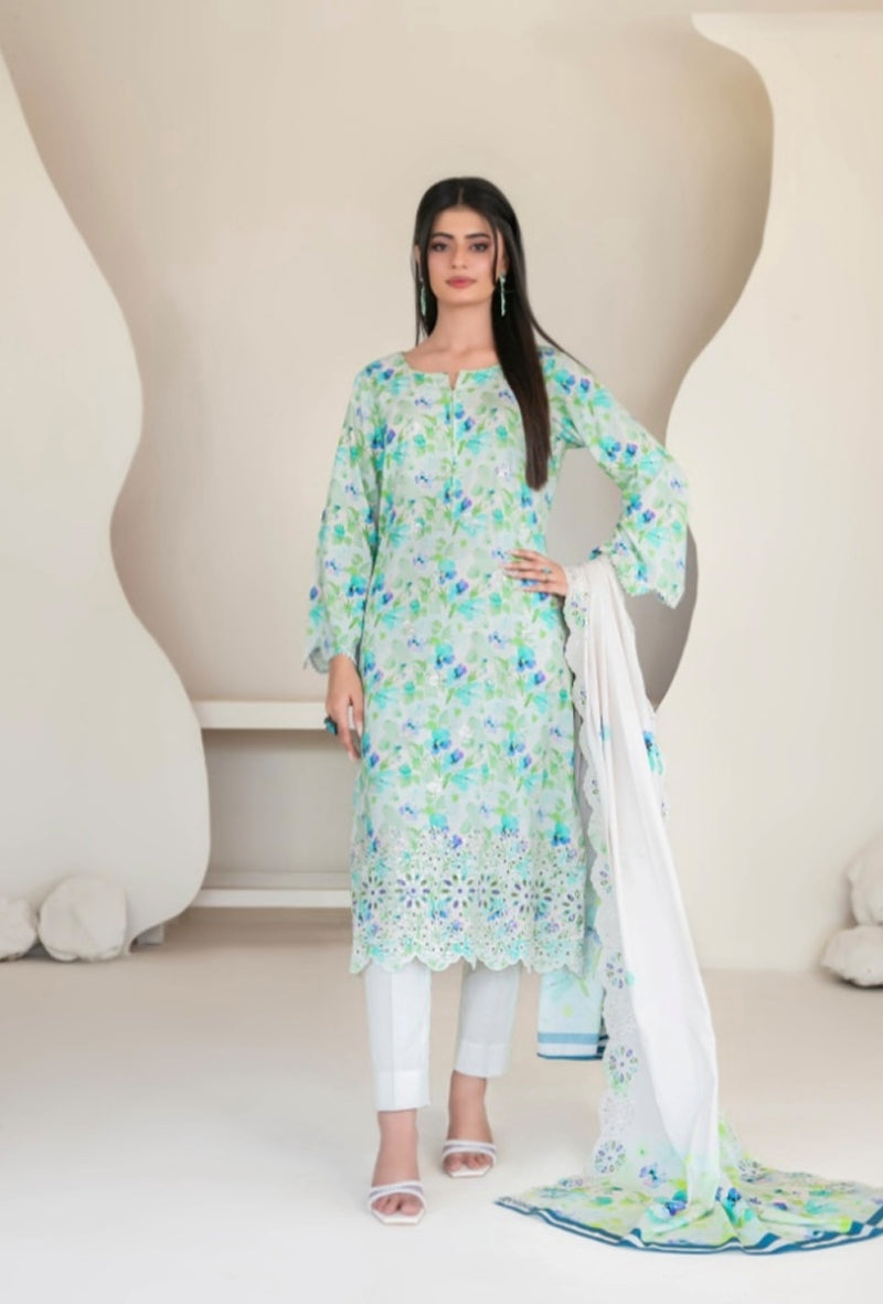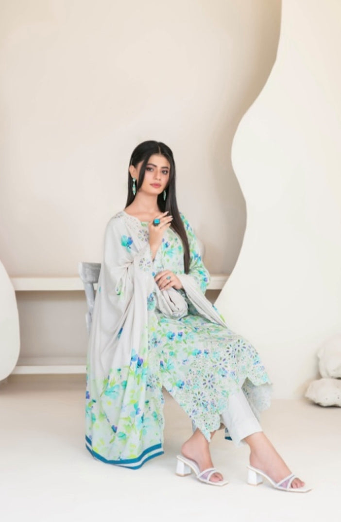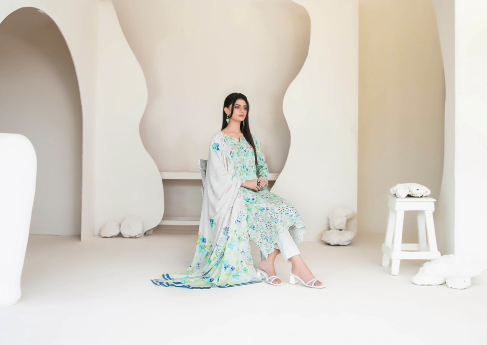 Un-stitched embroidered digital printed staple shirt designs bloom with delicate artistry, paired with embroidered digital printed staple shawl dupatta that drapes like a joyful veil.
