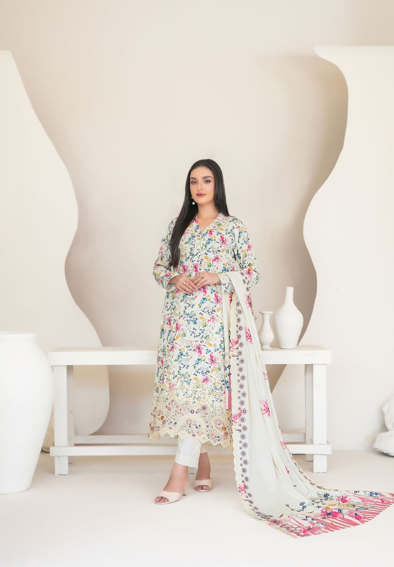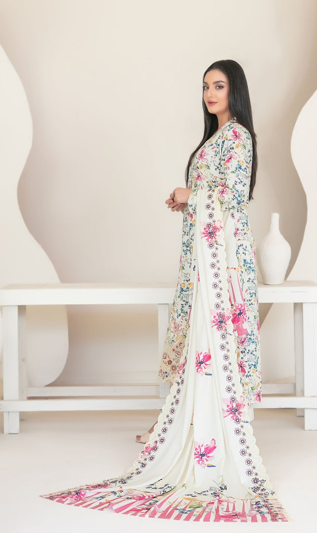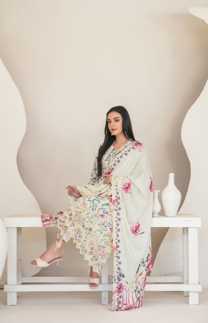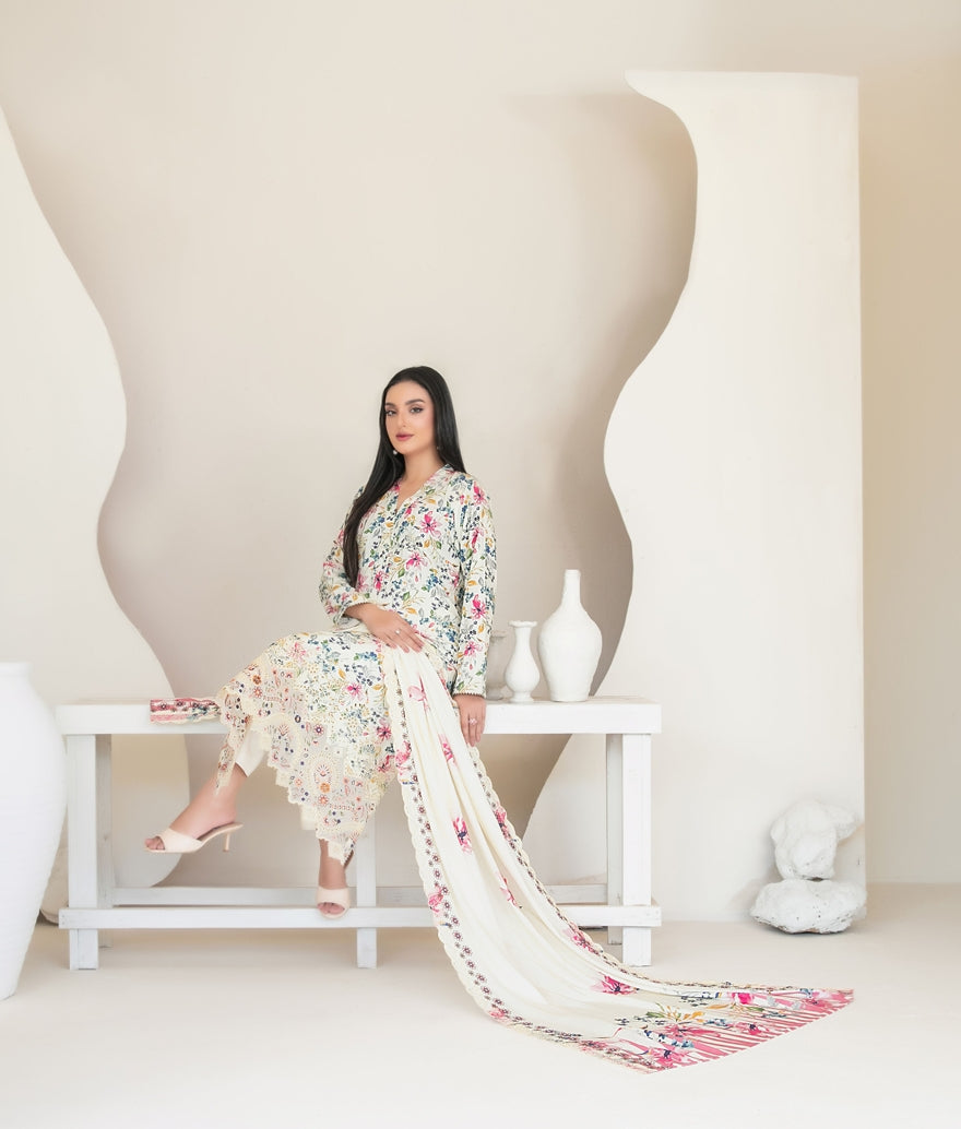 Un-stitched embroidered digital printed staple shirt designs bloom with delicate artistry, paired with embroidered digital printed staple shawl dupatta that drapes like a joyful veil.