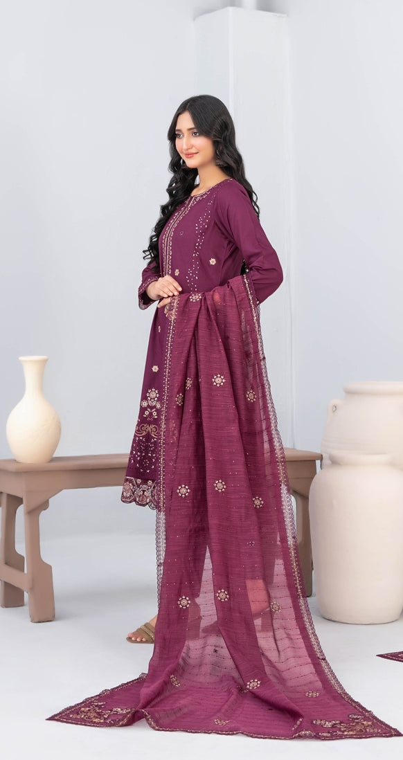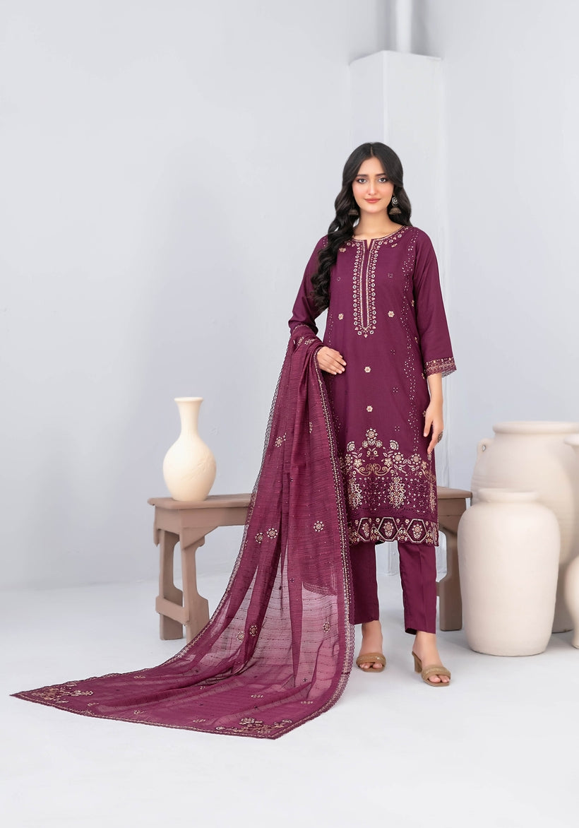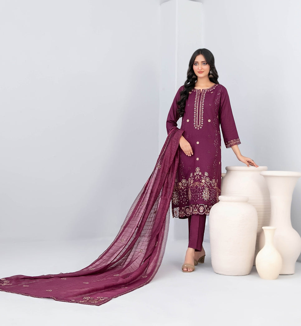 Elevate your winter wardrobe with Tawakkal Syera D-4451, a stunning 3-piece unstitched embroidered viscose slub suit that defines elegance and comfort.