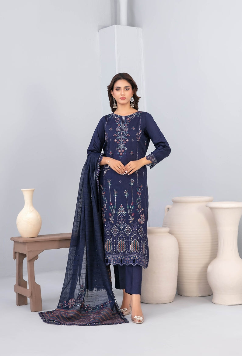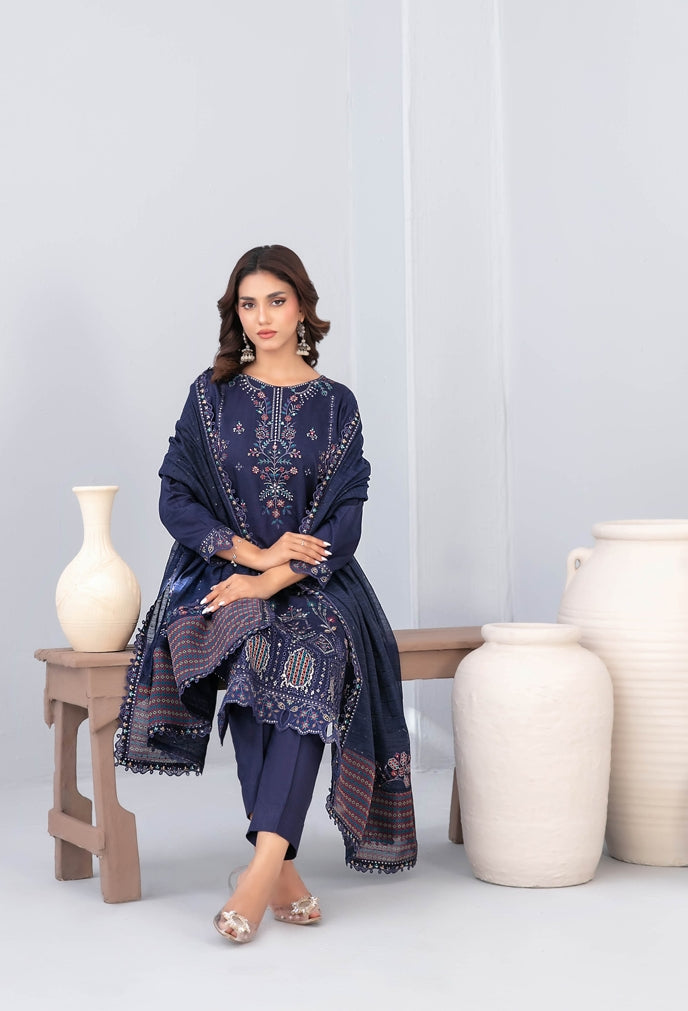 Elevate your winter wardrobe with Tawakkal Syera D-4451, a stunning 3-piece unstitched embroidered viscose slub suit that defines elegance and comfort.