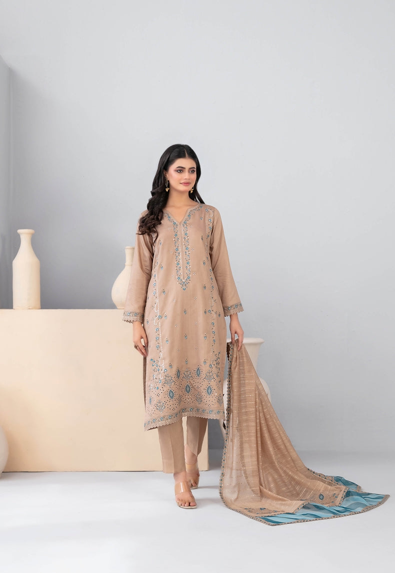 Elevate your winter wardrobe with Tawakkal Syera D-4451, a stunning 3-piece unstitched embroidered viscose slub suit that defines elegance and comfort.