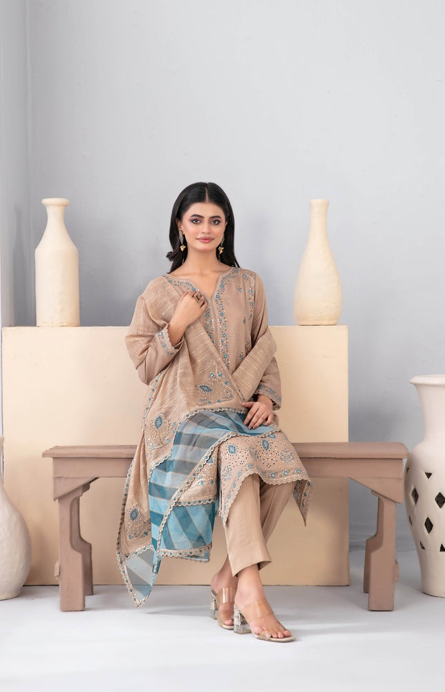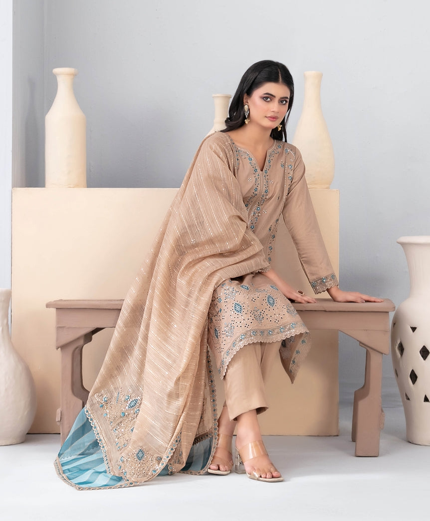 The embroidered viscose shirt adds a touch of luxury, while the exclusive embroidered fancy dupatta enhances its overall sophistication.