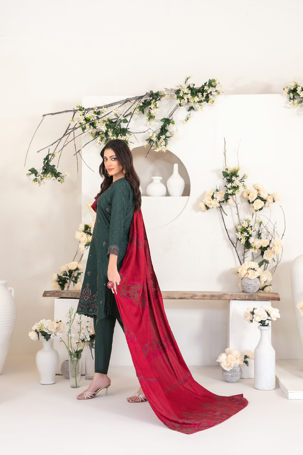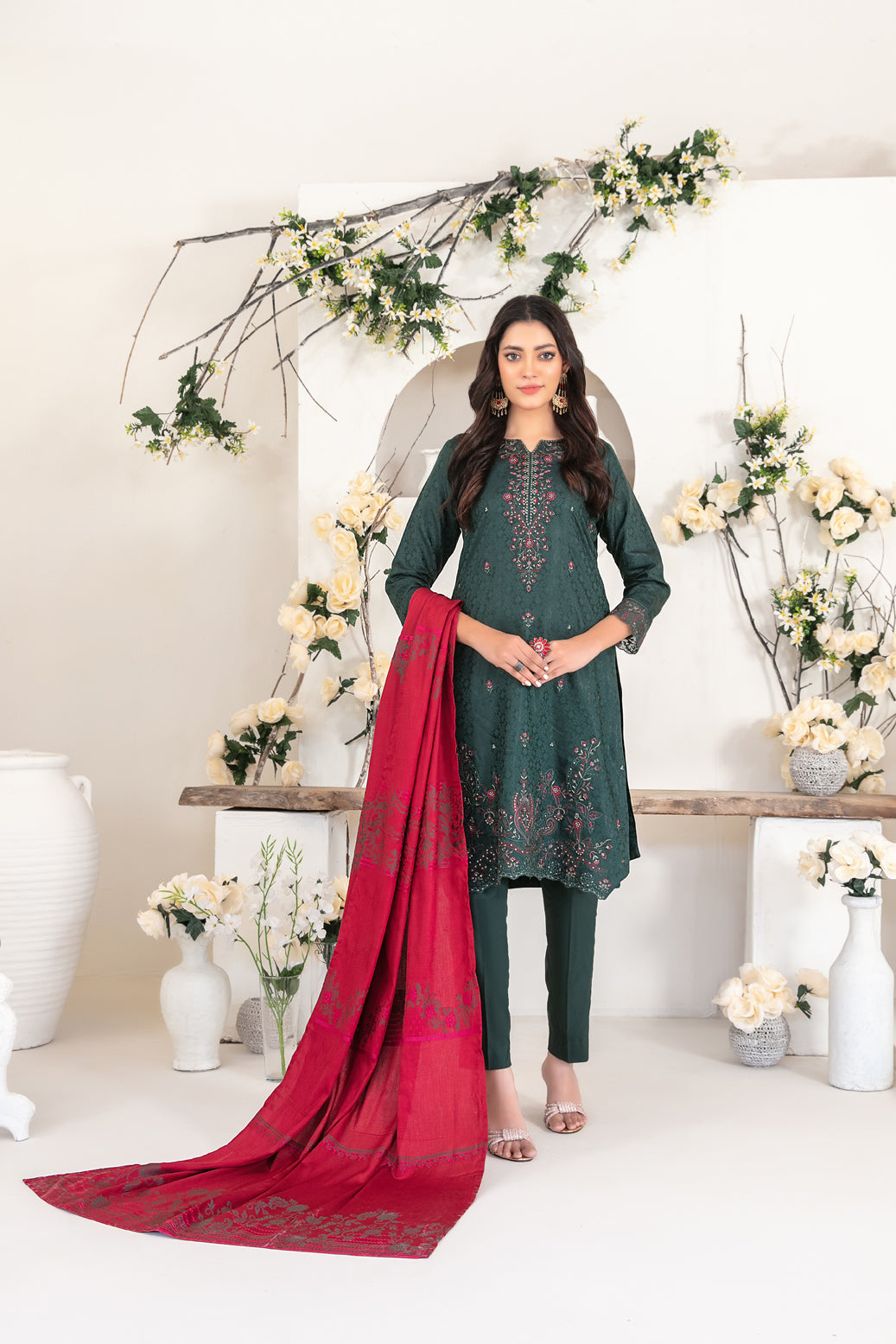 100% Original Brand Tawakkal – Yumna Collection Unstitched 3-Piece Embroidered Viscose Jacquard Dress featuring exclusive Banarsi shawl dupatta and plain staple shalwar fabric. A timeless outfit for wedding & party wear.