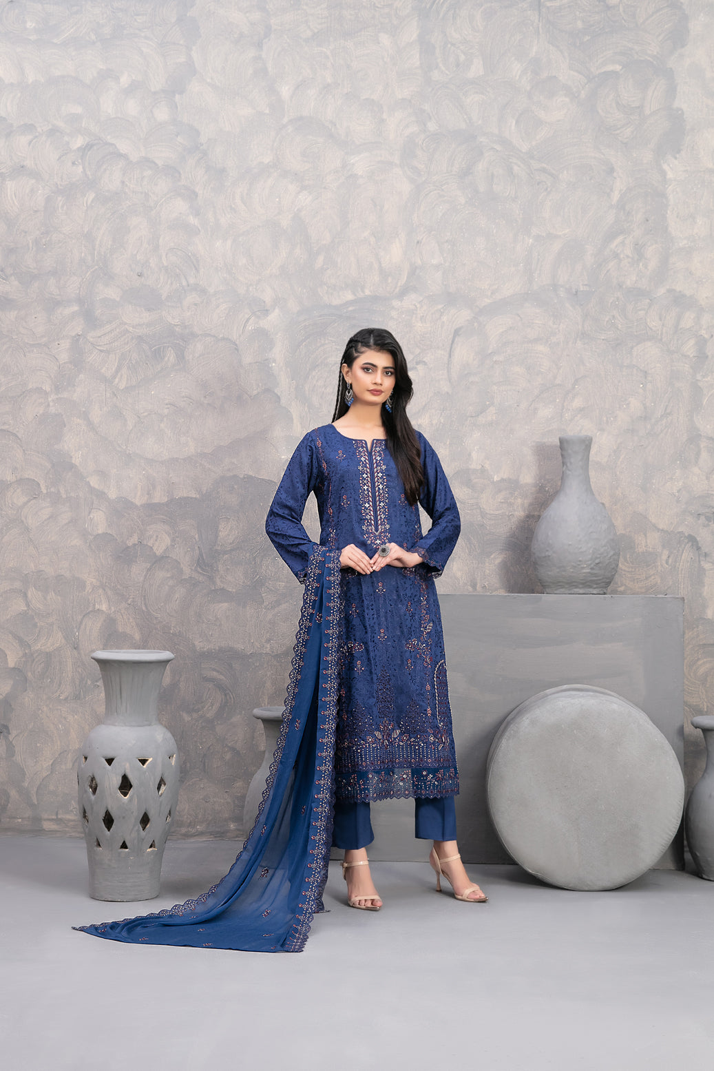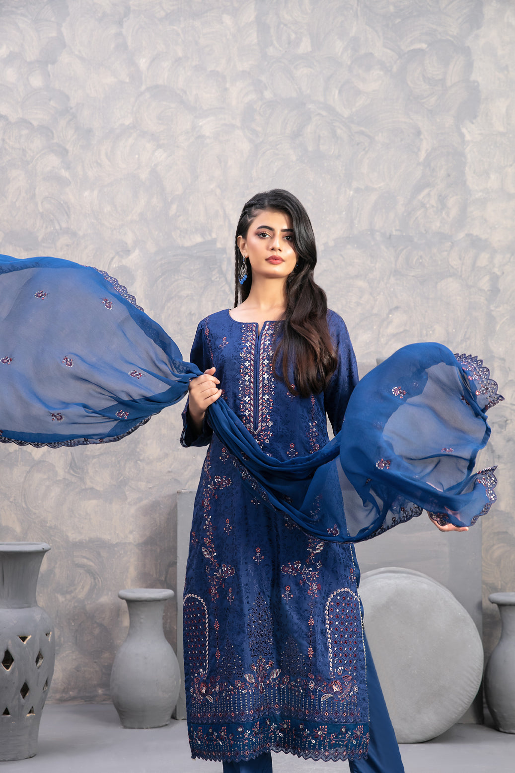 Upgrade your wardrobe with this embroidered viscose jacquard suit from the Tawakkal – Nafyssah Collection and embrace the season with grace and style.