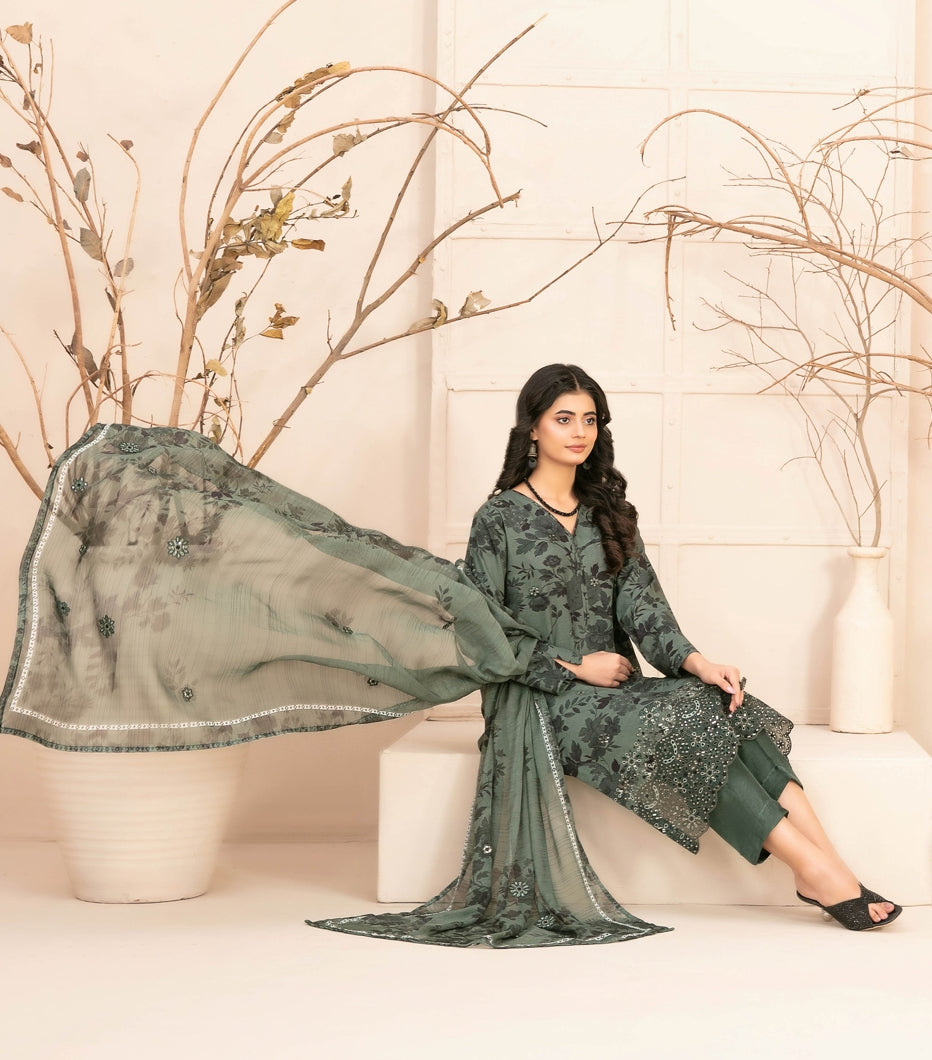 Un-stitched embroidered digital printed staple shirt designs flow with delicate artistry, paired with embroidered digital printed chiffon dupatta that drapes like a silken whisper.