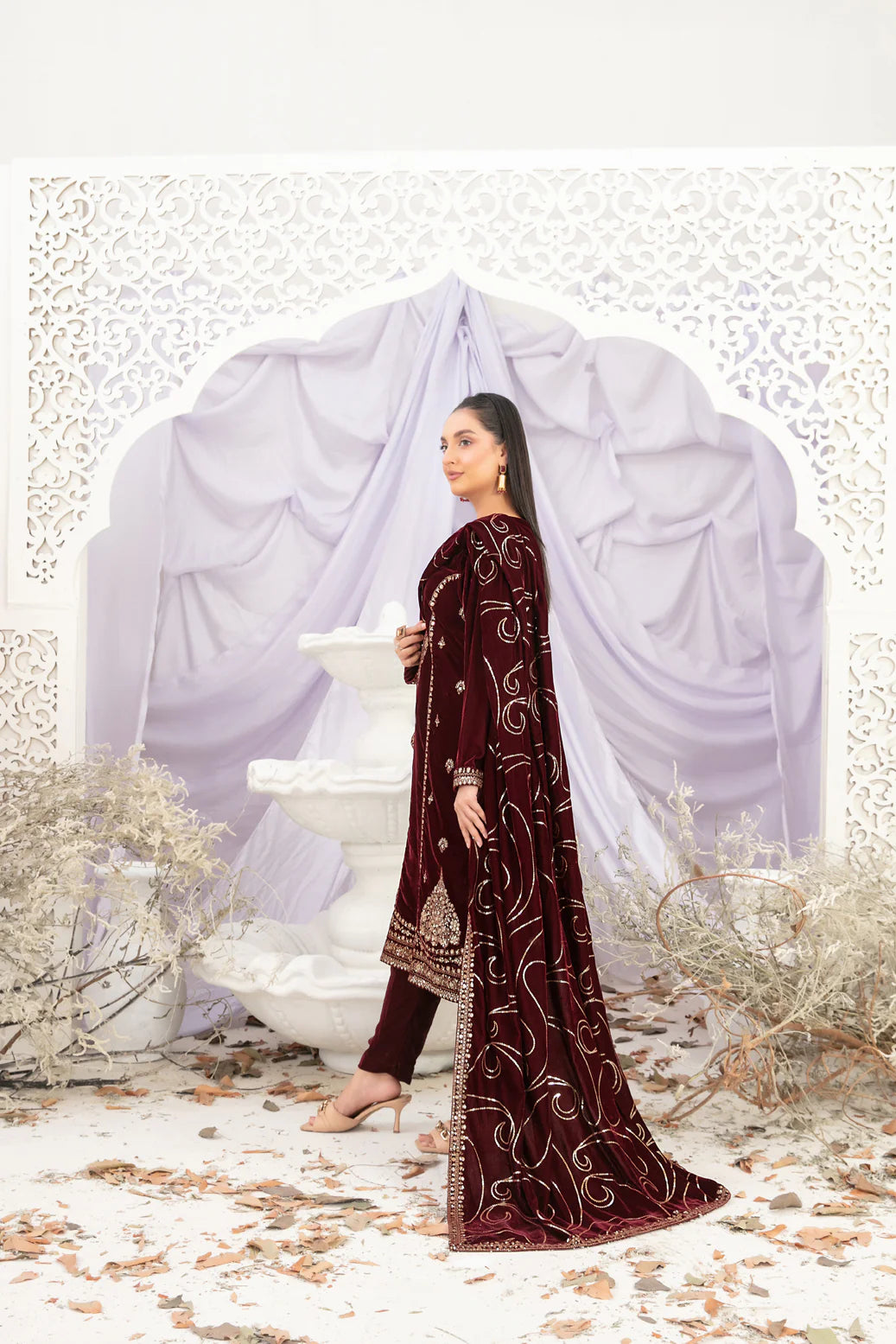 Drape royal velvet in TAWAKKAL Sajni D-5192 — a heavy embroidered velvet shirt, fancy embroidered velvet dupatta, and un-stitched velvet shalwar. Perfect for weddings, Eid, and regal winter nights.