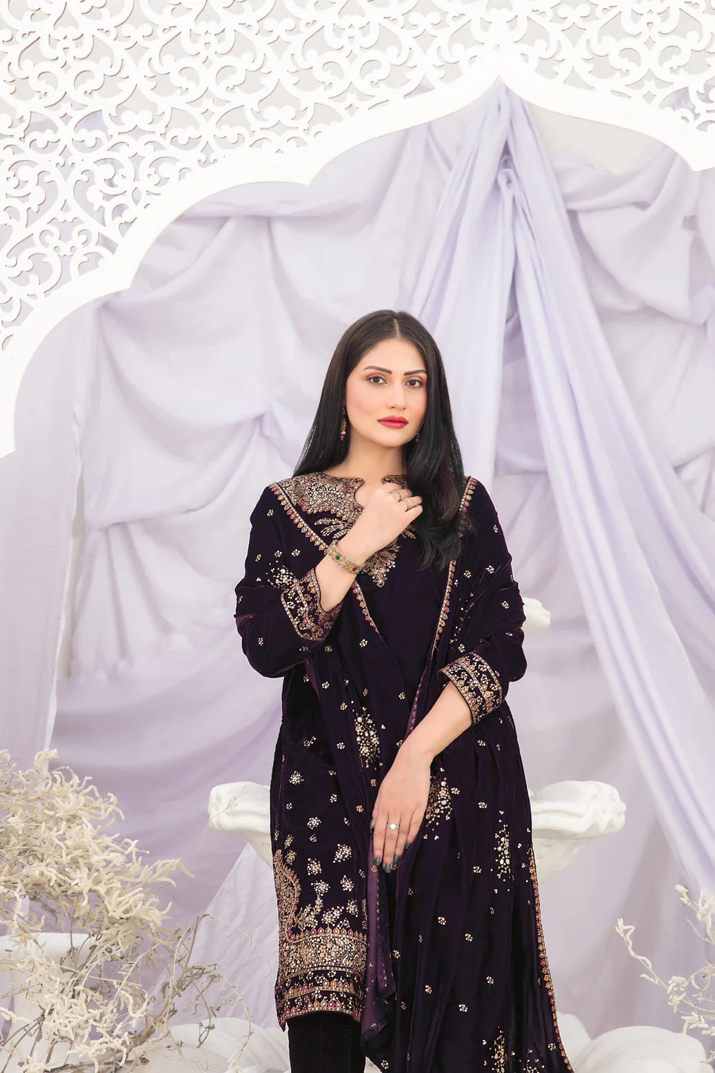 Un-stitched fancy heavy embroidered velvet shirt designs shimmer with intricate threadwork, paired with fancy embroidered velvet dupatta that flows like midnight royalty.