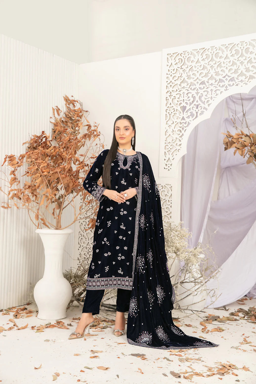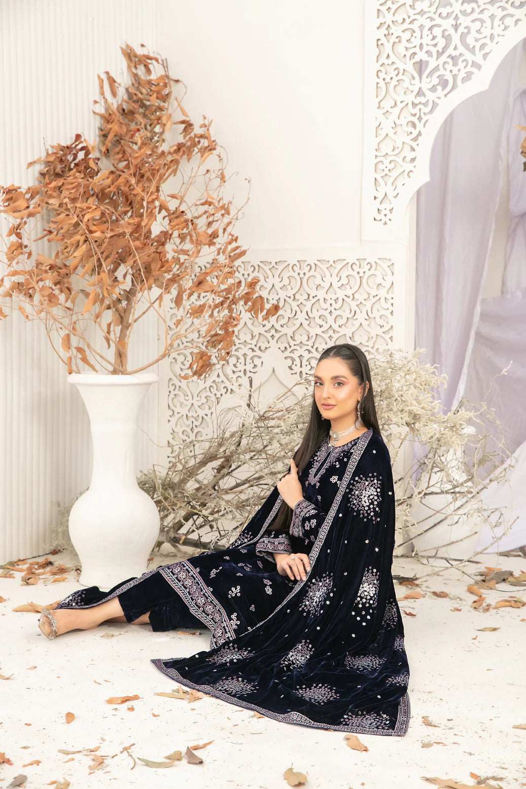 Drape royal velvet in TAWAKKAL Sajni D-5198 — a heavy embroidered velvet shirt, fancy embroidered velvet dupatta, and un-stitched velvet shalwar. Perfect for weddings, Eid, and regal winter nights.
