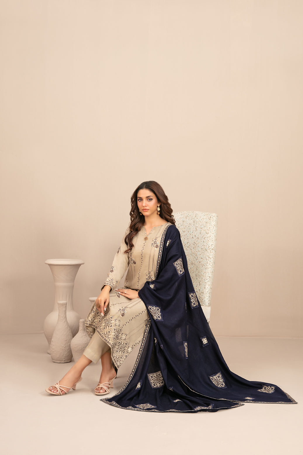 The semi-stitched embroidered shirt offers versatility in fitting and style, while the embroidered shawl adds an extra layer of luxury to your festive or formal look.