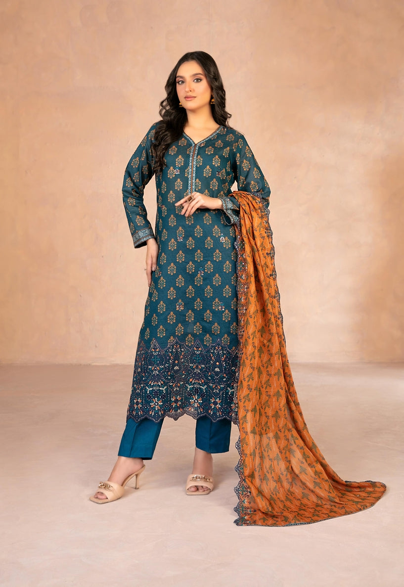 TAWAKKAL Daaliya D-2941 Brings Sparkling, Elegant And Timeless Charm. The Un-Stitched Embroidered Digital Printed Chamki Lawn Shirt Features Beautiful Digital Print With Fine Embroidery And Chamki (Sequins/Shimmer) Work That Gives A Soft, Breathable, Shimmery, And Premium Appearance.