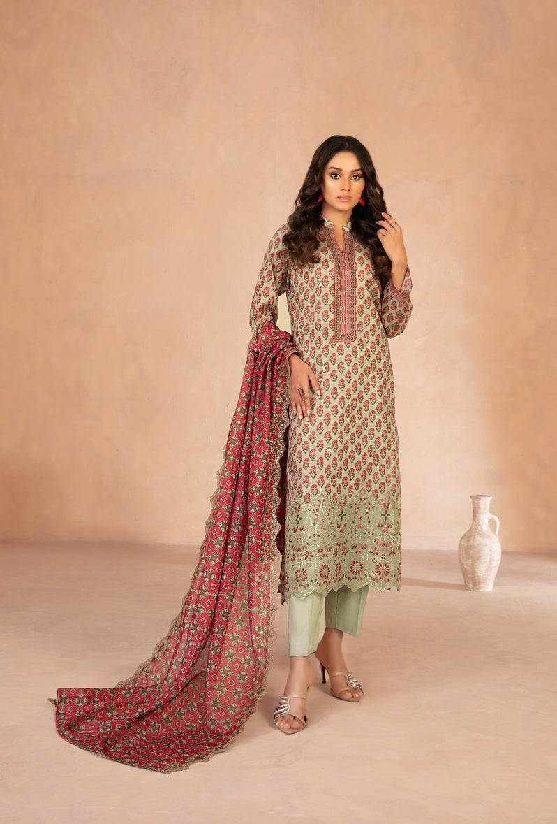 Sparkling Embroidered Digital Printed Chamki Lawn In TAWAKKAL Daaliya D-2942 — Un-Stitched Embroidered Digital Printed Chamki Lawn Shirt, Cutwork Embroidered Digital Printed Chamki Lawn Dupatta, And Un-Stitched Plain Cotton Shalwar. Perfect For Summer, Eid, Festive Gatherings, And Shimmery Graceful Look.