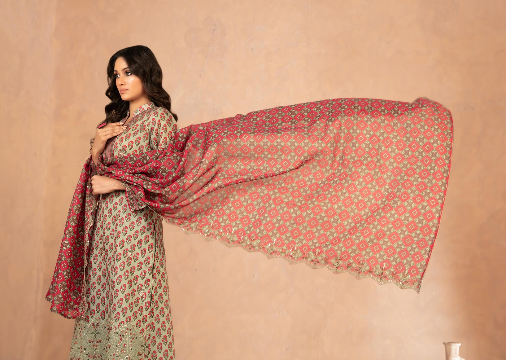 Cutwork Embroidered Digital Printed Chamki Lawn Dupatta Is Lightweight, Flowy, And Luxurious — With Intricate Cutwork, Digital Print And Chamki Detailing That Adds Graceful Movement And High-End Sophistication.