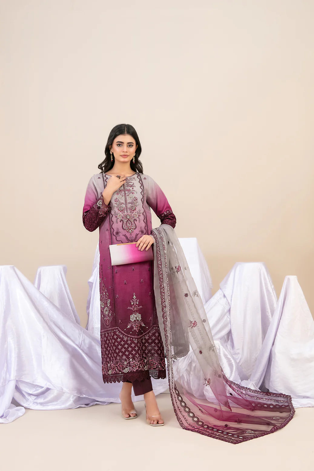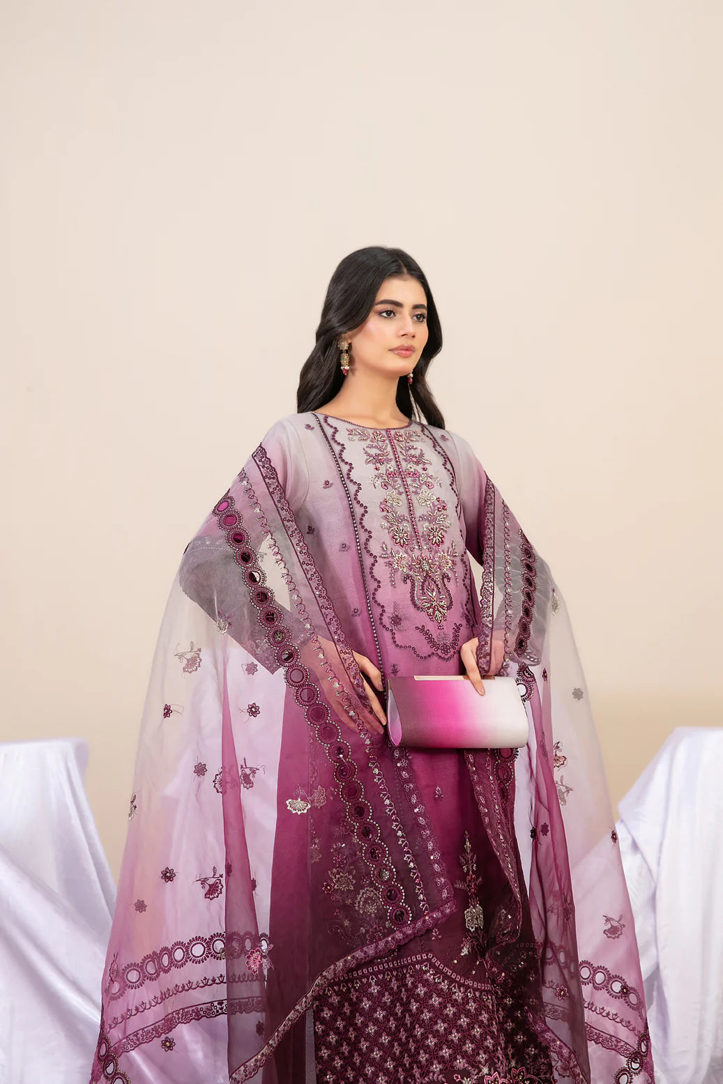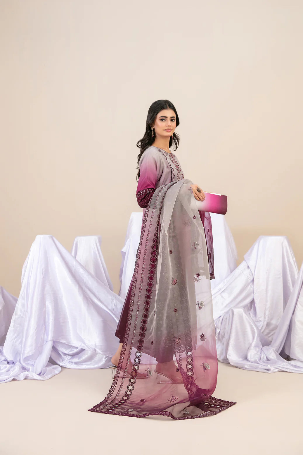 Semi-stitched fancy heavy embroidered organza shirt with embellishments & digital ombre printed raw silk inner creates a breathtaking effect, paired with exclusive fancy embroidered ombre organza dupatta that flows like a dream.