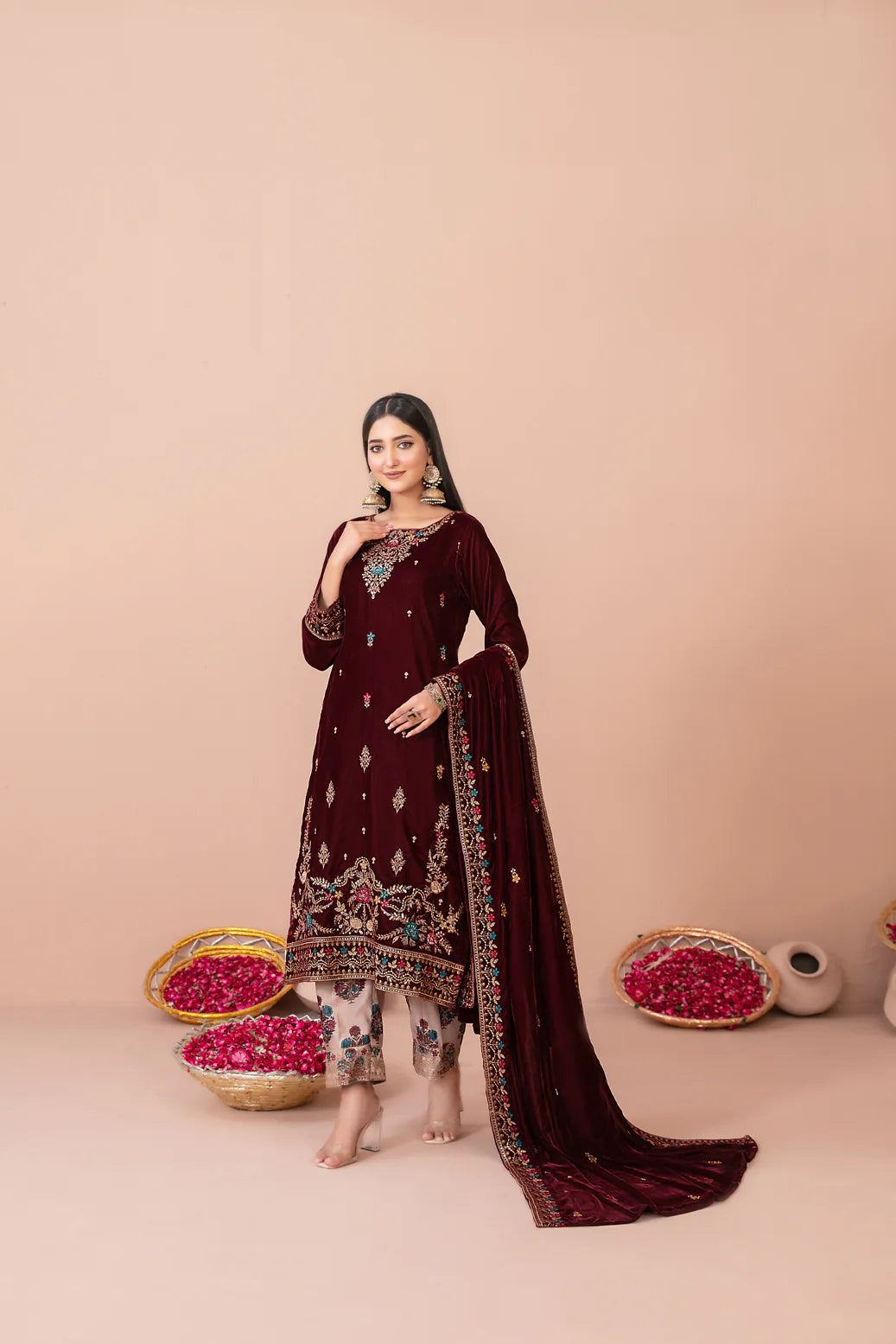Un-stitched fancy heavy embroidered velvet shirt designs shimmer with rich threadwork, paired with fancy embroidered velvet dupatta that drapes like a queen’s cape.