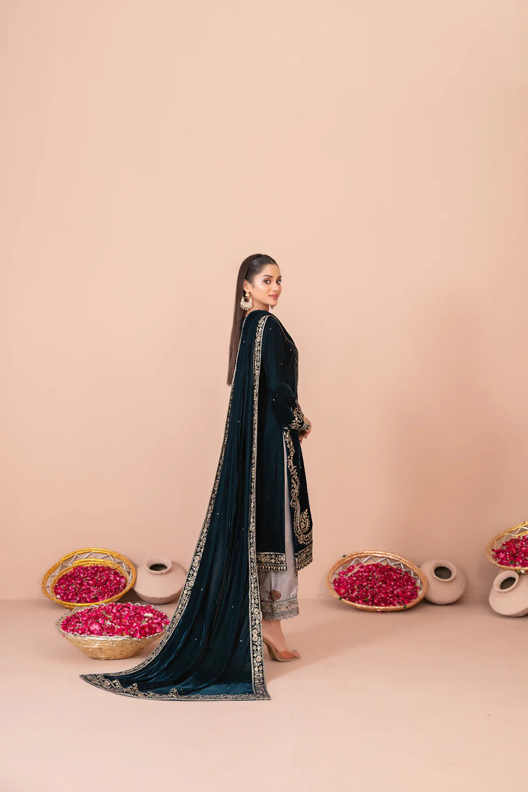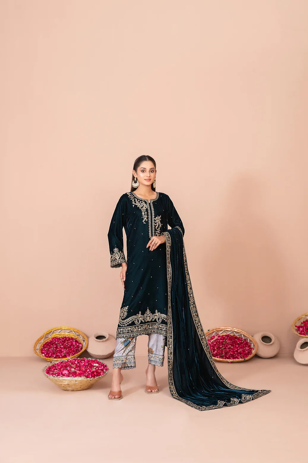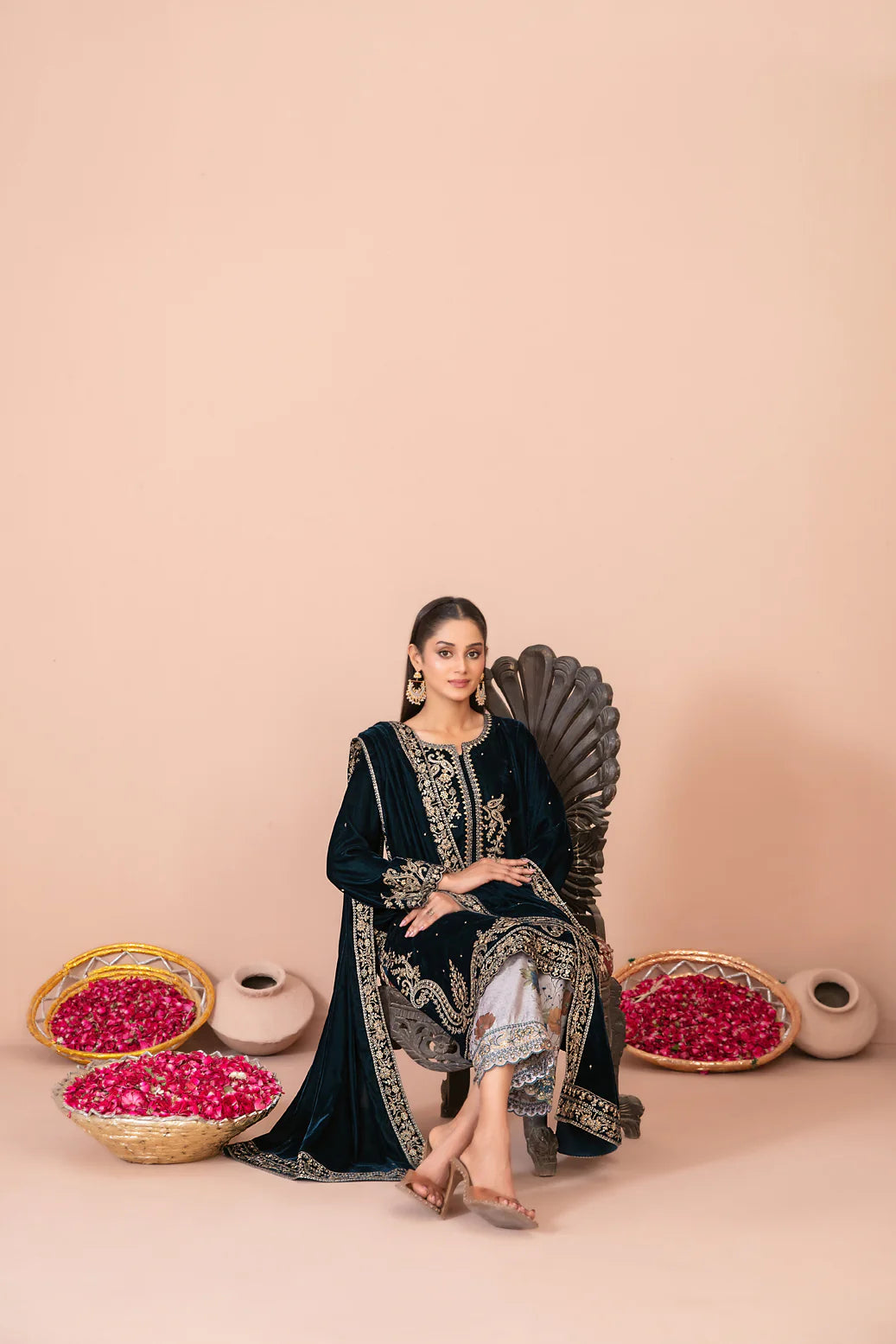 Wrap yourself in velvet luxury with TAWAKKAL Makhmali D-5331 — a heavy embroidered velvet shirt, fancy embroidered velvet dupatta, and printed velvet embroidered shalwar. Perfect for winter weddings, Eid, and royal evenings.