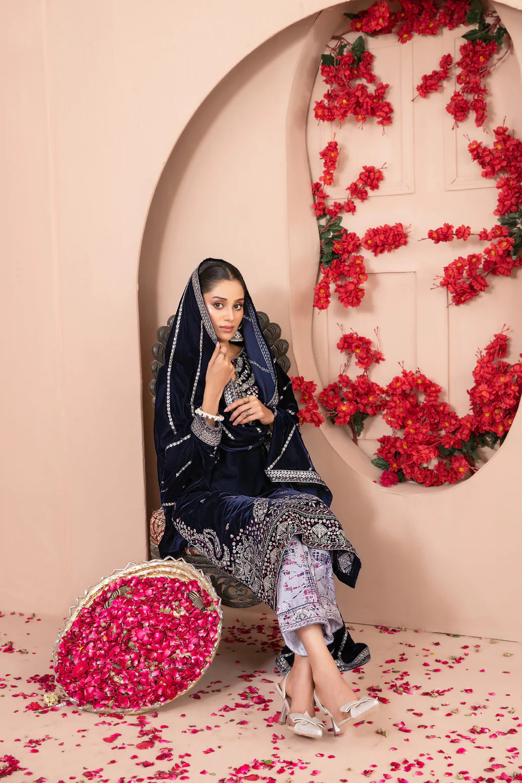 Un-stitched fancy heavy embroidered velvet shirt designs shimmer with rich threadwork, paired with fancy embroidered velvet dupatta that drapes like a queen’s cape.