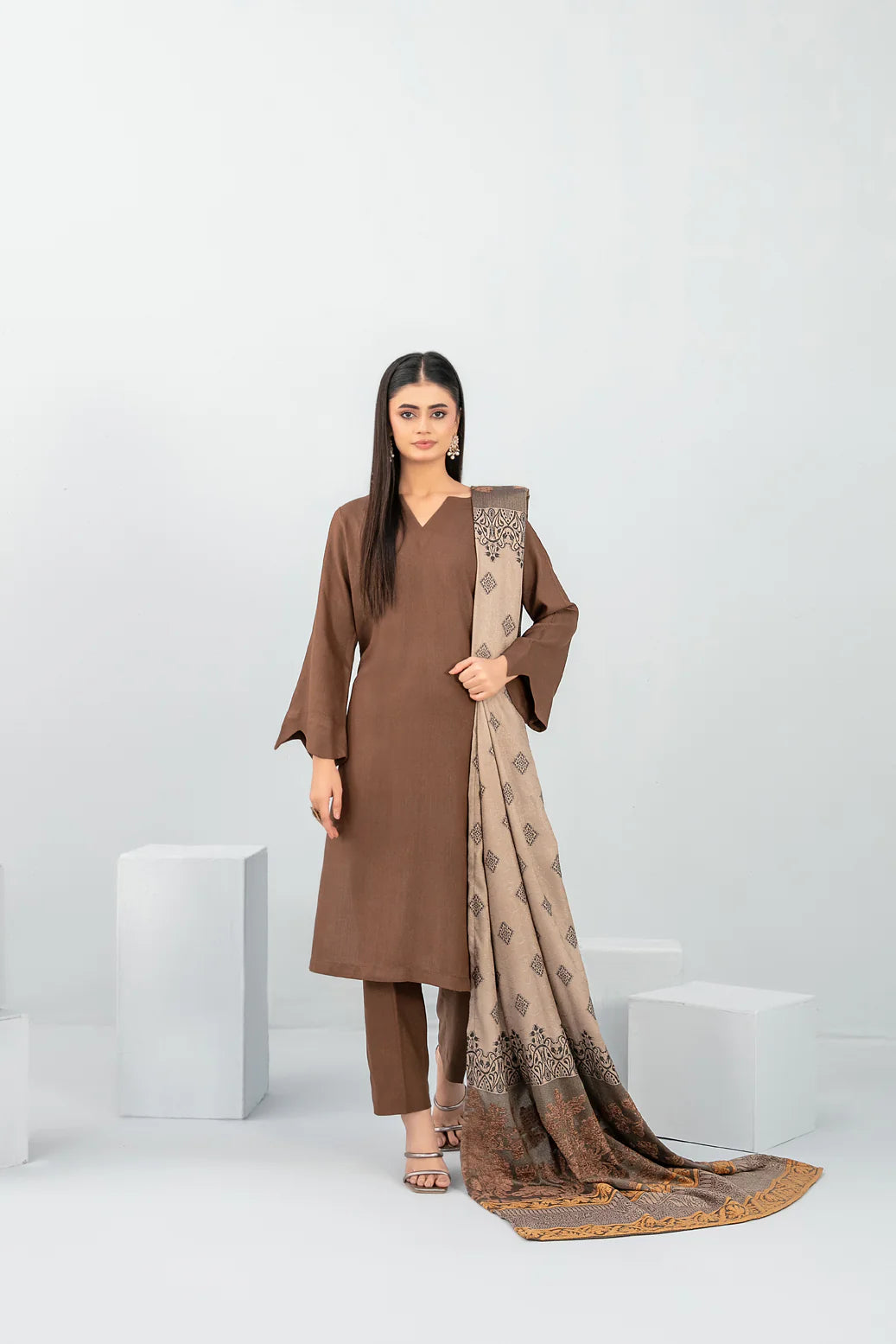 Un-stitched exclusive plain leather peach shirt fabric offers soft warmth and premium feel, paired with exclusive fancy shawl dupatta that adds instant grace.