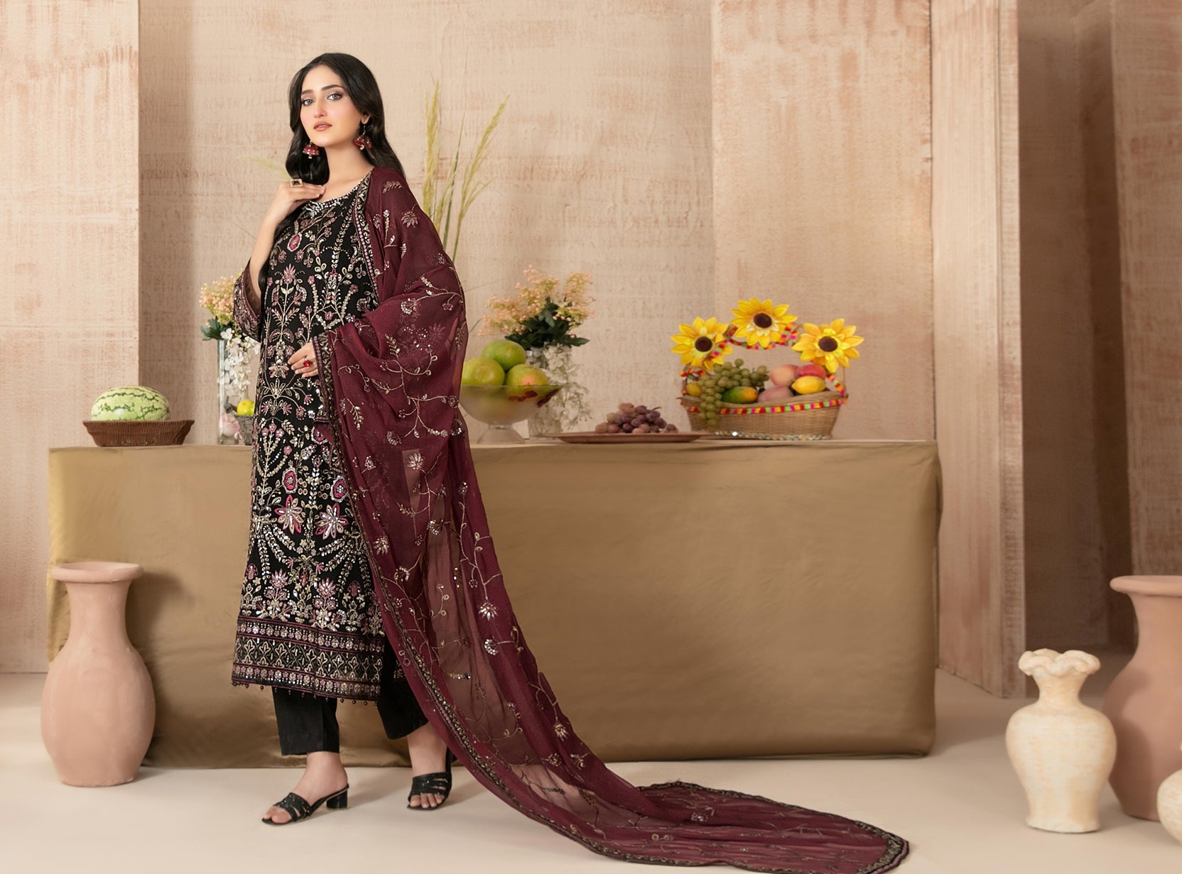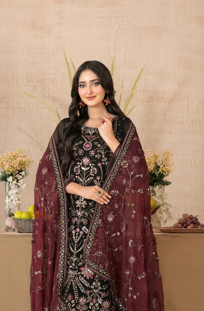Semi-stitched fancy embroidered chiffon shirt designs with exclusive embellishments blend heritage craftsmanship with modern glamour, paired with exclusive embroidered chiffon dupatta that flows like a family heirloom.