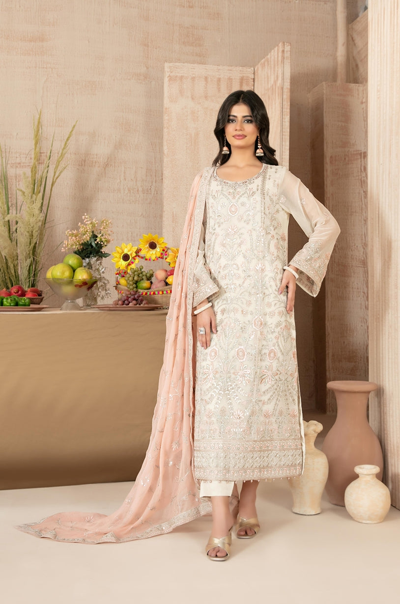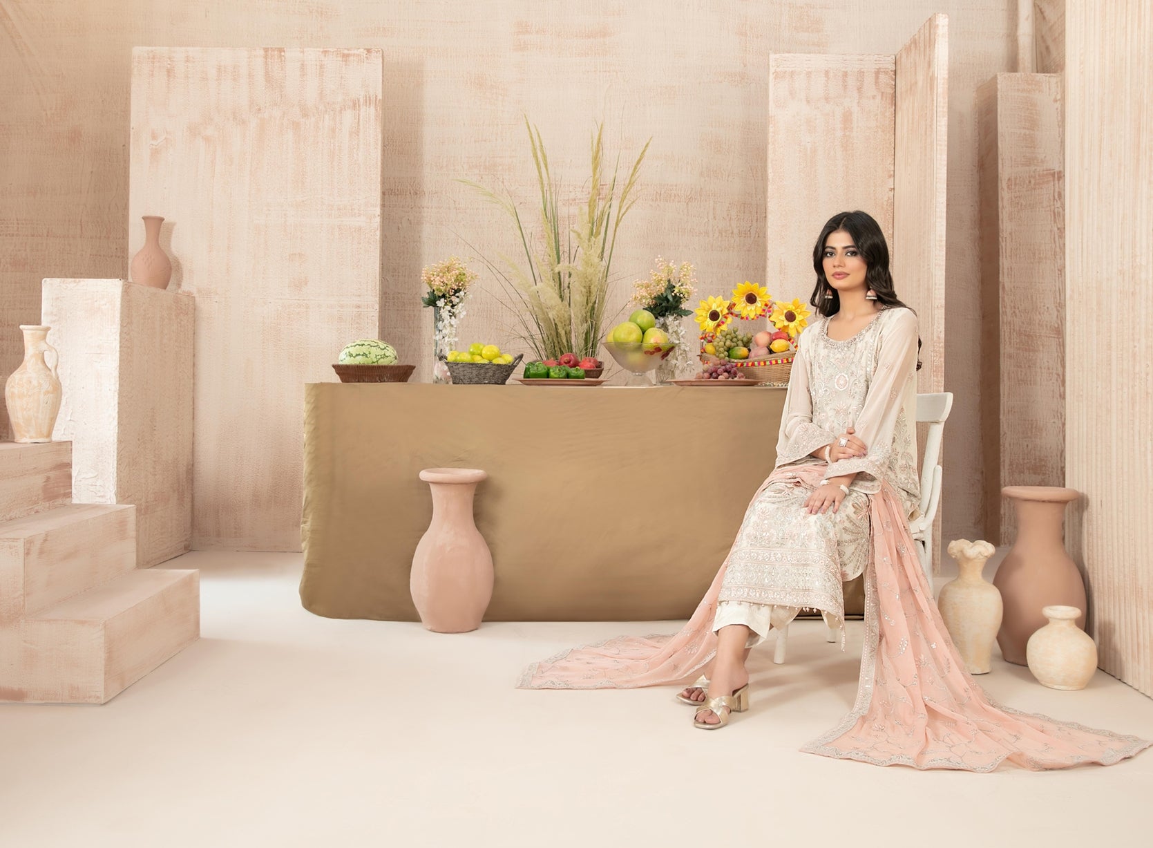 Semi-stitched fancy embroidered chiffon shirt designs with exclusive embellishments blend heritage craftsmanship with modern glamour, paired with exclusive embroidered chiffon dupatta that flows like a family heirloom.