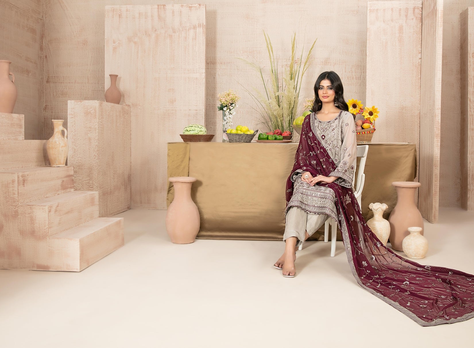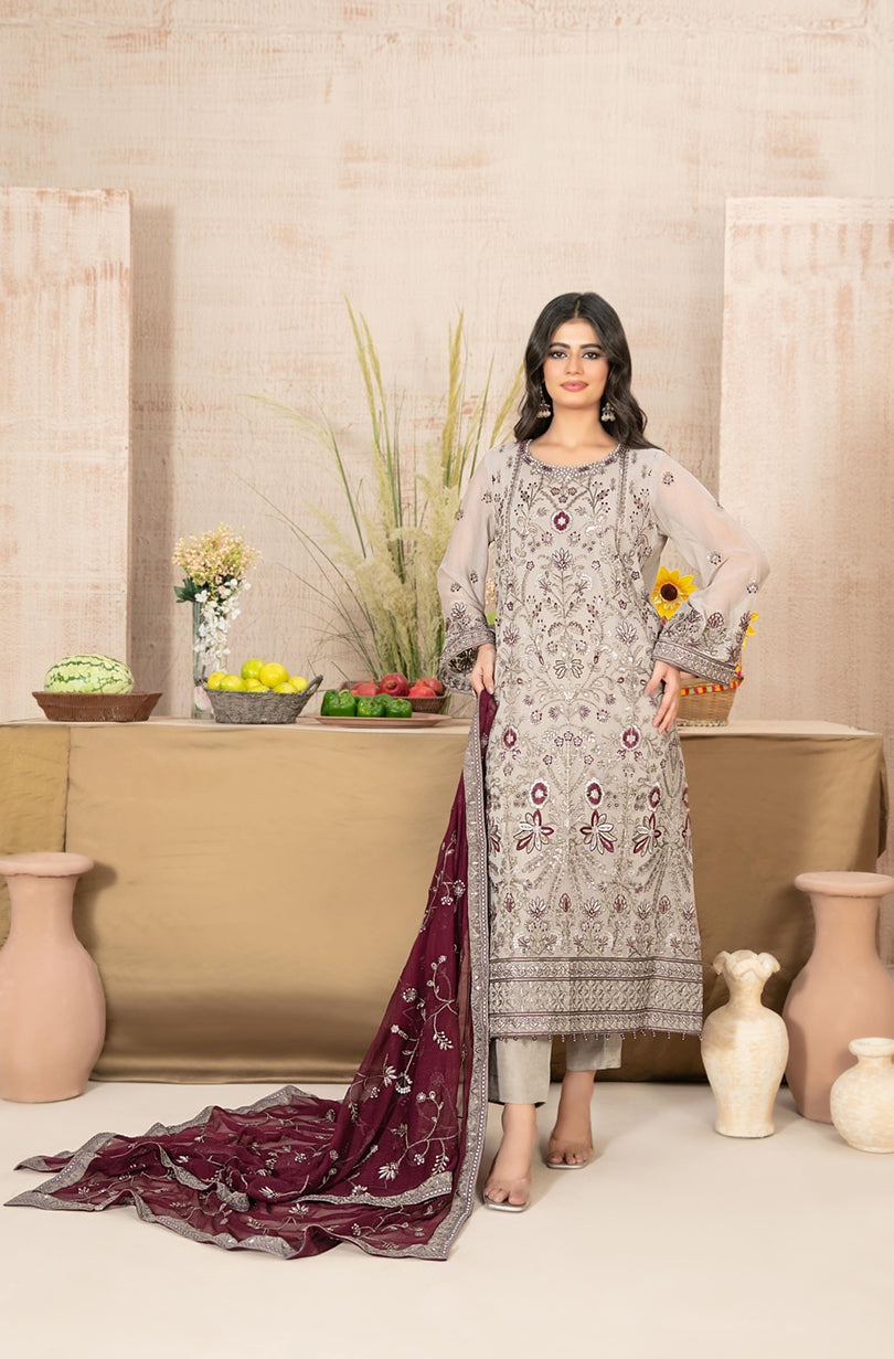 Semi-stitched fancy embroidered chiffon shirt designs with exclusive embellishments blend heritage craftsmanship with modern glamour, paired with exclusive embroidered chiffon dupatta that flows like a family heirloom.